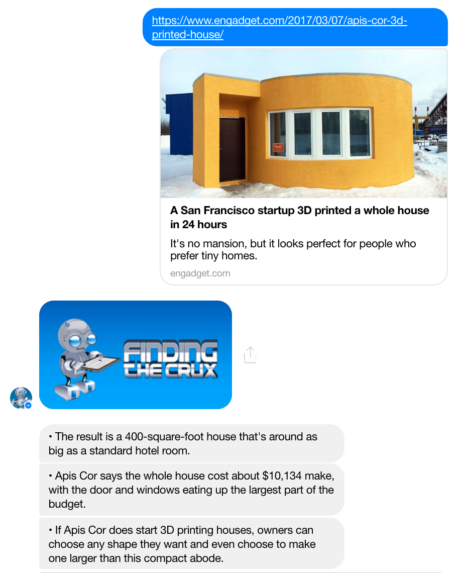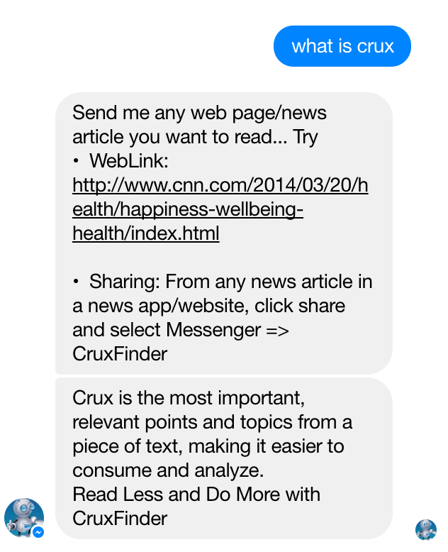 I am excited to announce the Beta version availability for Cruxfinder, AI based bot on Messenger that helps you to be more productive and make you stay informed quickly.