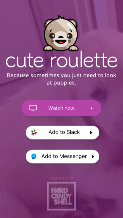 (Re)Introducing Cute Roulette, an on-demand, endlessly distracting cute GIF dispenser bot from Hard Candy Shell. Available in Slack, Facebook Messenger, and at cuter… See more
