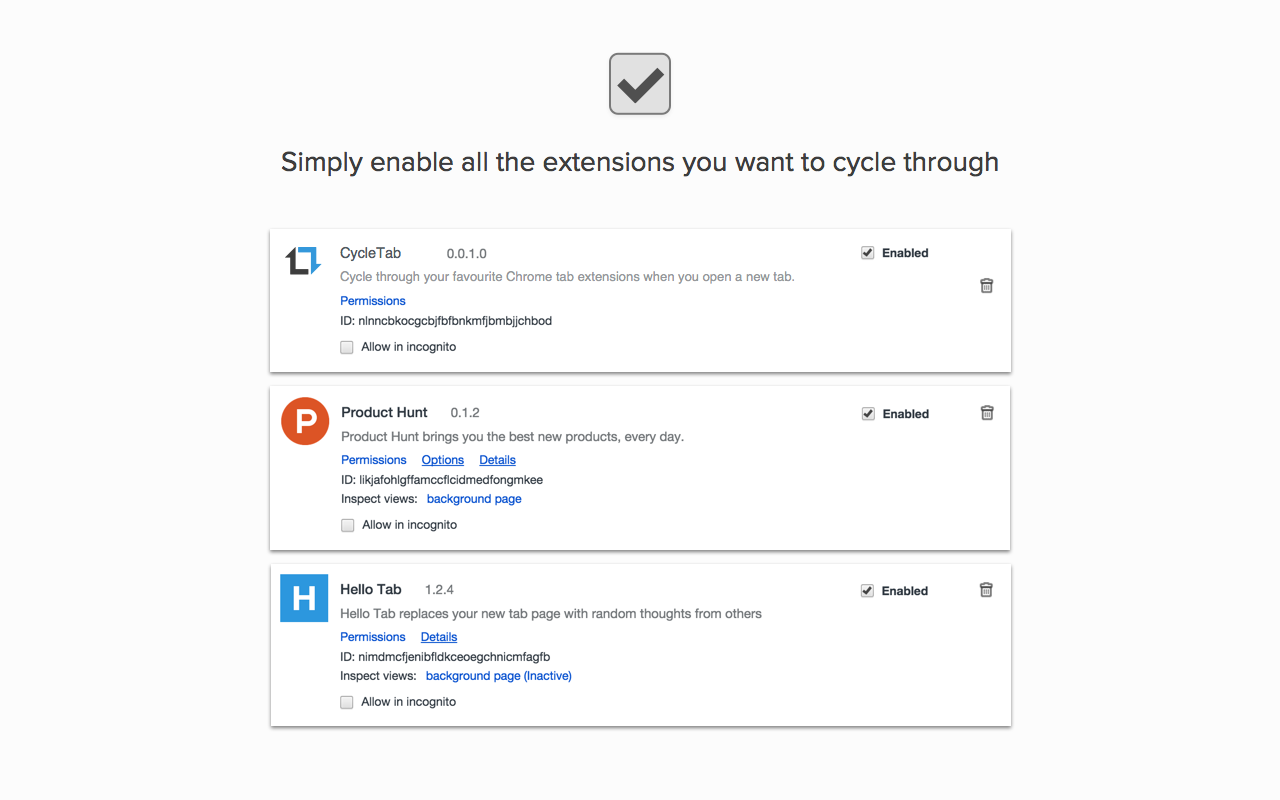 I was frustrated with the fact that I had to choose between using the Product Hunt or Panda or Hello Tab Chrome extension, because I wanted to use all of them!