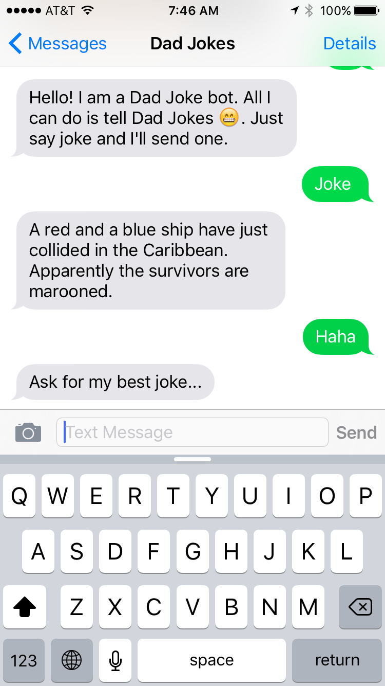 There are a lot of very serious bots. They try to solve novel AI problems. This is just meant to be fun. It can only tell Dad Jokes. It has a very narrow domain. Just text 631-954-2447 to get things started. I built this using Dexter (https://rundexter.com/app) and Twilio.