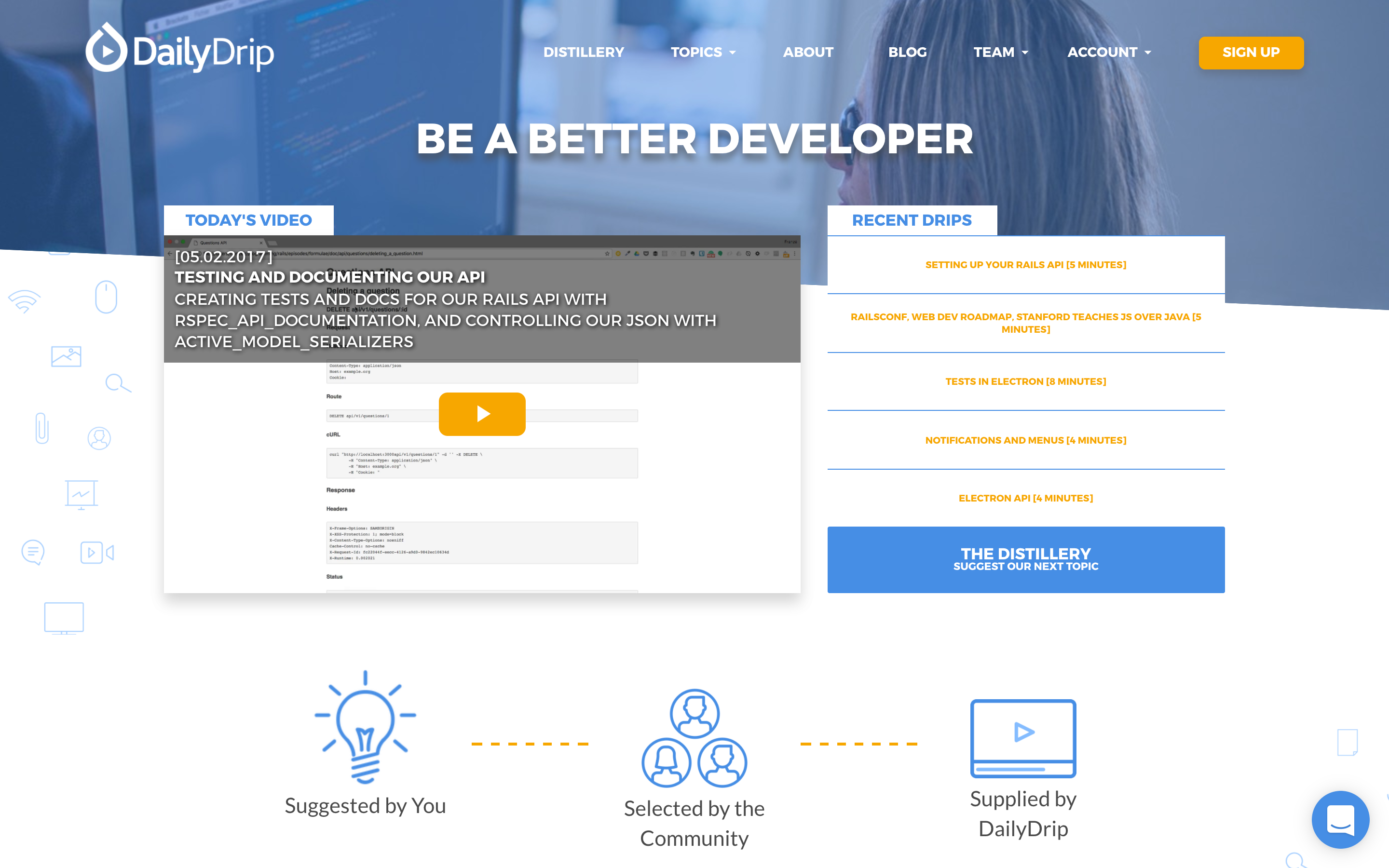 Josh and I founded DailyDrip to help you be a better developer. We believe that software is the biggest force multiplier available. By helping developers be more effective we can help them create a better world.