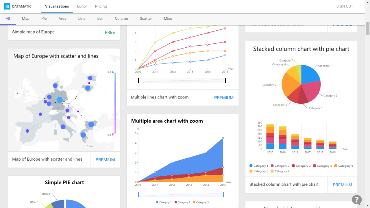 Datamatic is like WordPress for interactive data visualizations. It allows you to pick a data visualization template, edit it in a simple online editor and publish on any website. All templates are hand crafted and optimized to be styled and customized.