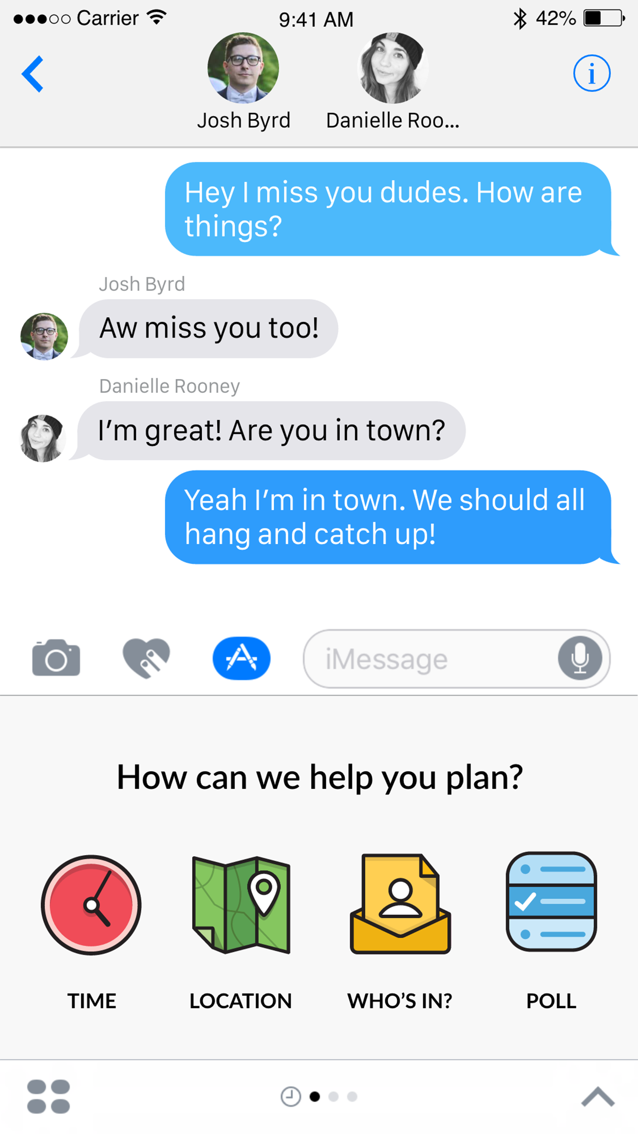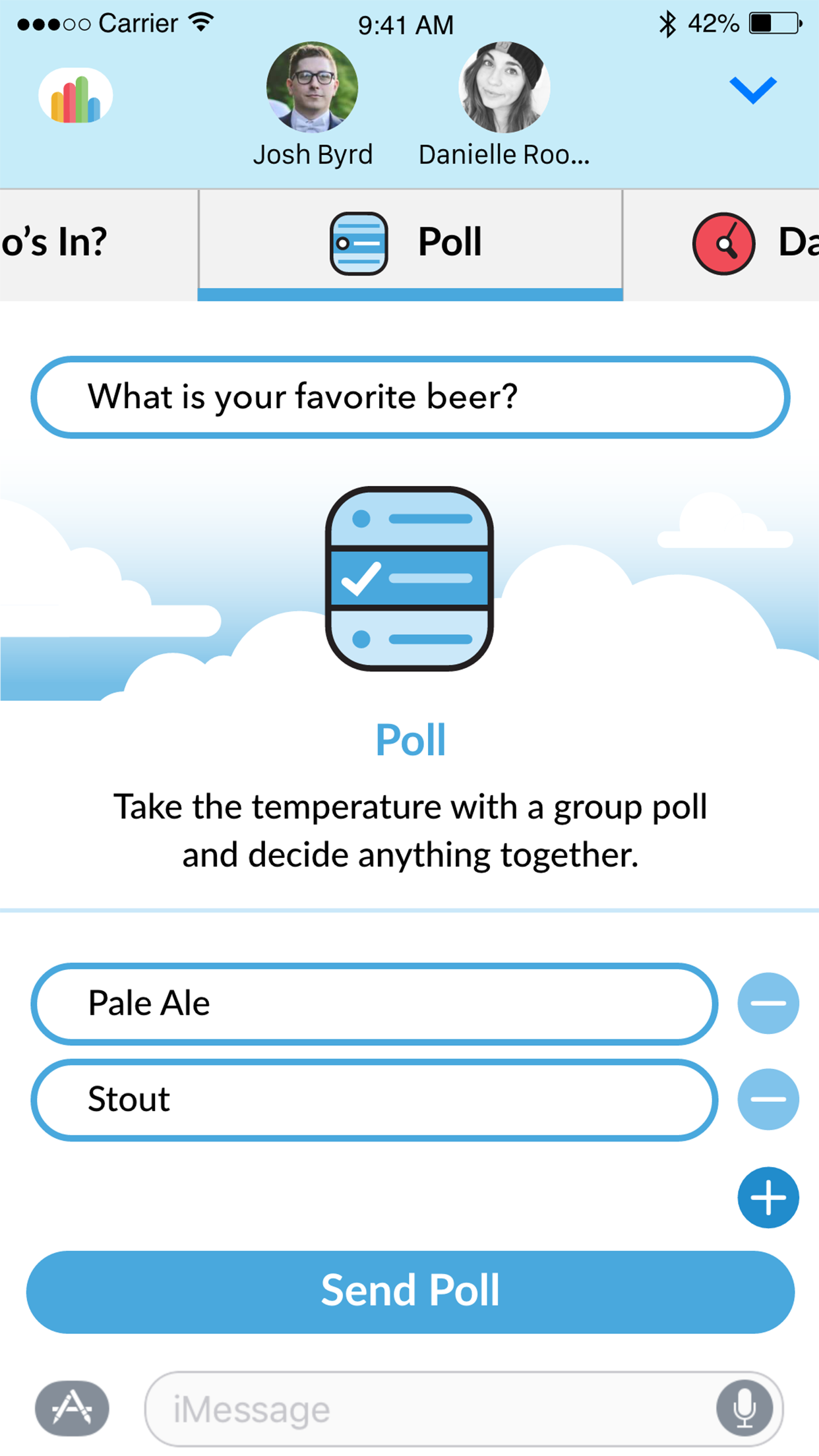 Daybook integrates polling into iMessage so groups of friends can easily make decisions together. Our custom bubbles allow you to suggest times, locations, see who's in, or conduct free-form polling. Deciding anything is super easy. When locations have been suggested, users can see all of the plac… See more