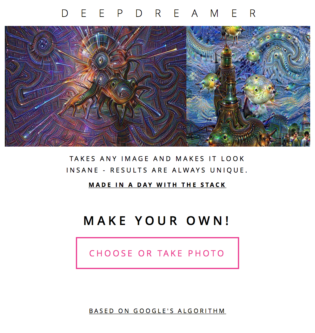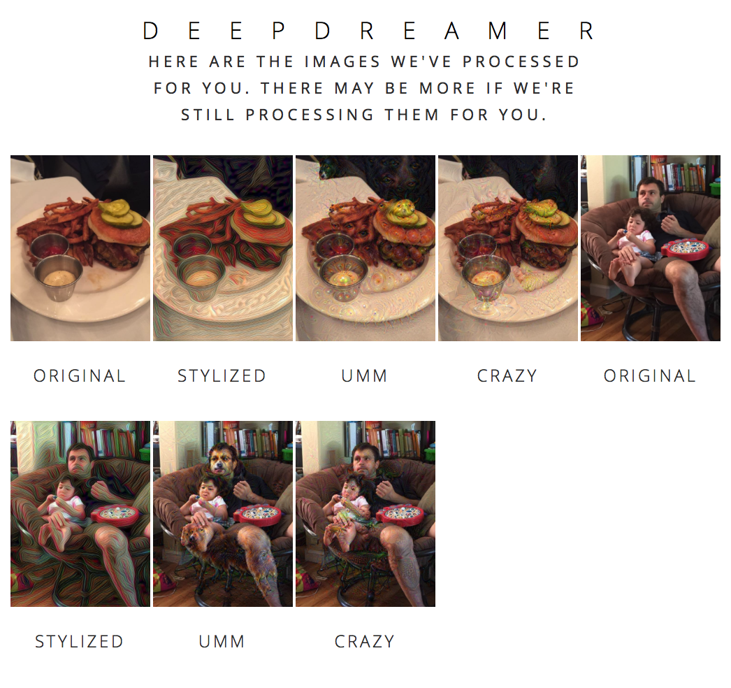 The recent code released by Google is good if you’re a researcher (check out that link if you don’t know it), but for ordinary people to play with deep dreaming it’s out of reach. We created this site to make it simple for anyone to play with this new technology, while creating unique GIFs to boot. We are continually creating new effects that automatically g… See more