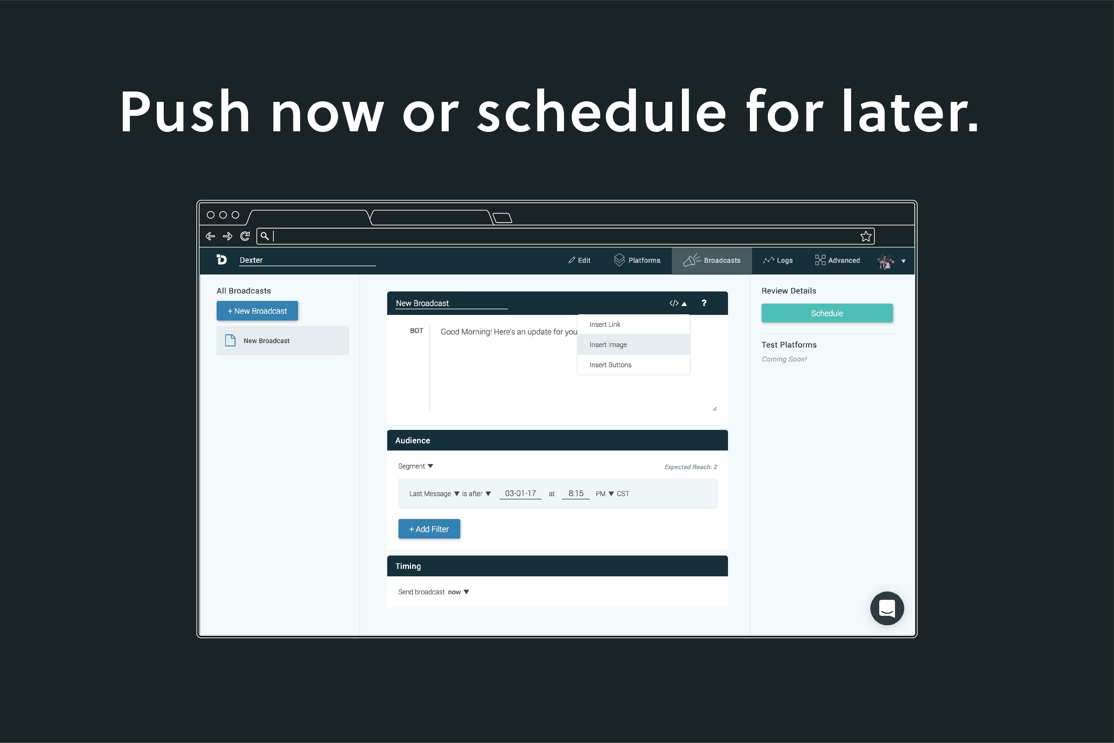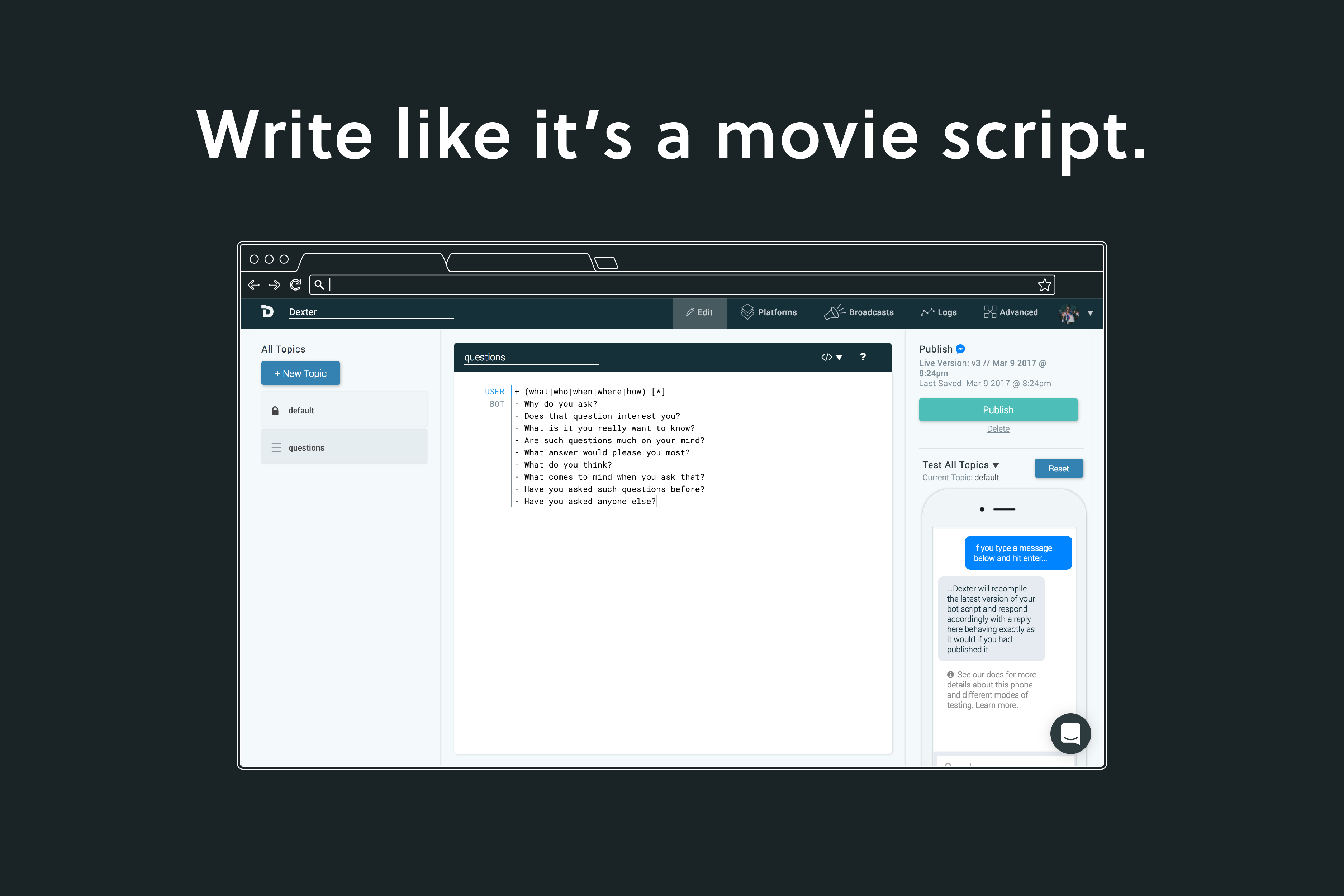 I've tried a bunch of the "Bot builders" and I can confidently say Dexter is both the simplest to use AND the most powerful one out there.
