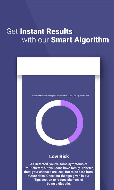 As Diabetes is getting increased day by day all over the world; a surprising fact is - 1 out of 2 person; who has diabetes doesn't even knows about it. With the algorithm in app, you can check whether you have diabetes or not and get personalized tips. With just tap-tap-tap!