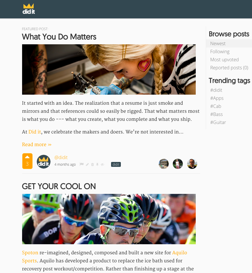 We believe that the resume is dead. Creating, making and doing is what is critical to your career and life. We created did it as a place to track what you do, a place to give kudos to the people you collaborate with and a place to explore the body of work by other creators and doers.
