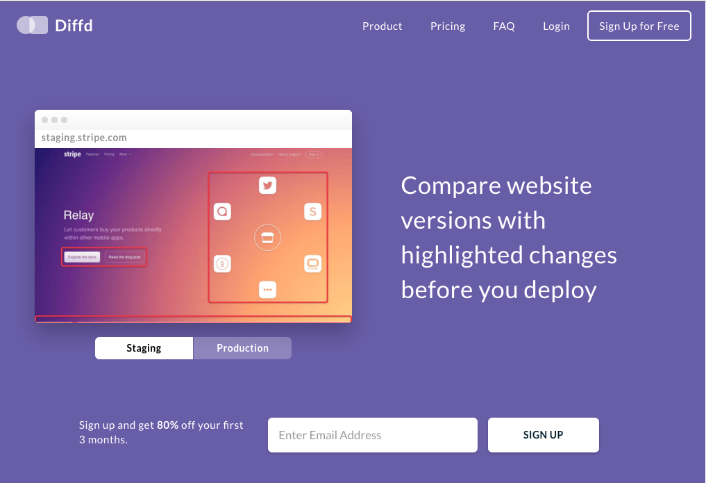 Diffd compares your new website changes with your existing site visually. See the difference between two versions and find bugs before you push code live.