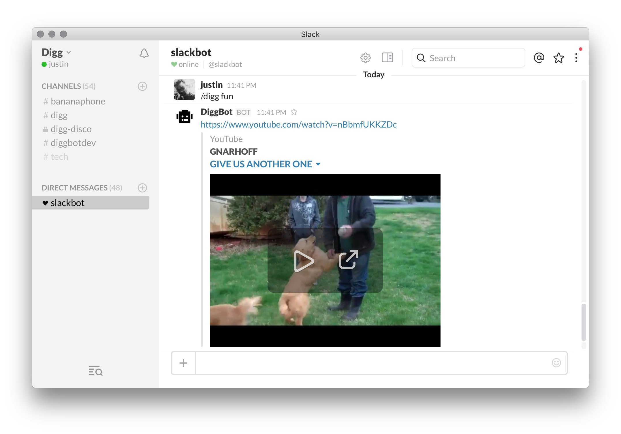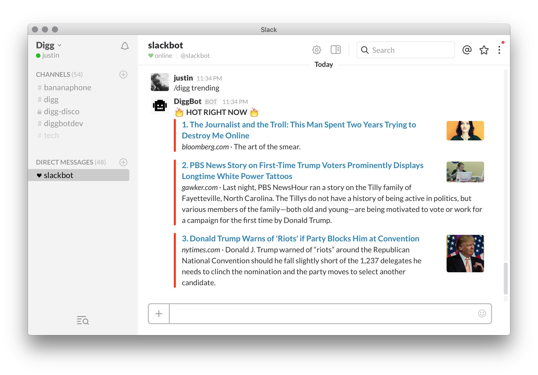 We're excited to share v1 of DiggBot with you on Slack. It's a news and content bot that sits on top of Digg's deep cross-publisher data -- 7.5mm new articles daily, from 10mm RSS feeds and 200mm tweets a day! DiggBot will push trending and breaking news, as well as Digg Editions, a twice-daily recap of the best stuff on the internet. You can also a… See more