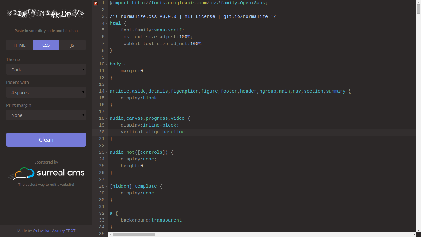 Thanks for the upvotes, everyone! Some info: DirtyMarkup uses tidy-html5 (a fork of the original Tidy), a fork of CSS Tidy, and JS Beautify for HTML, CSS, and JS respectively.