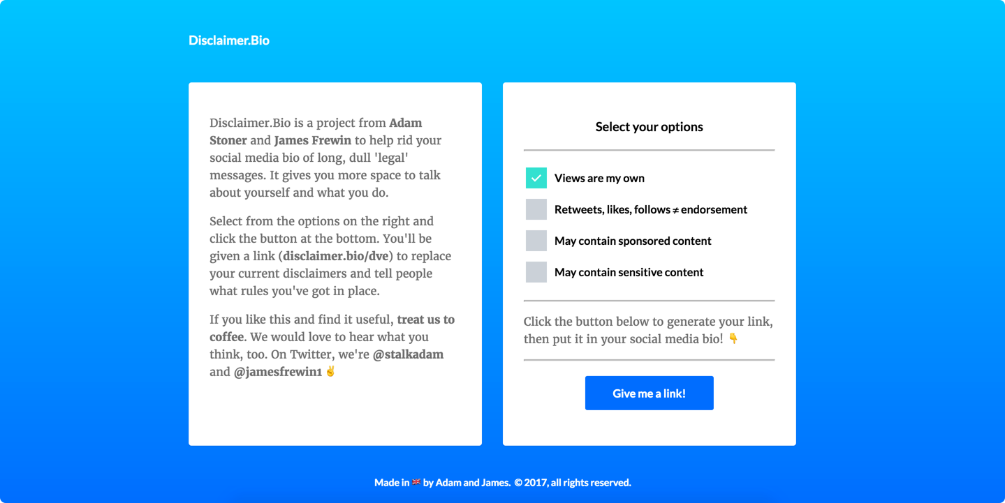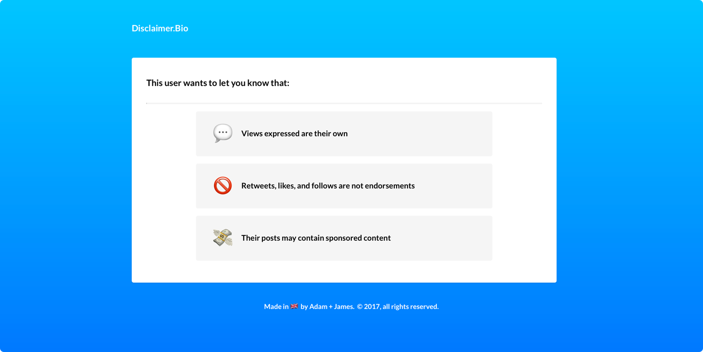 Hi everyone! 👋 My friend Adam (@stalkadam) and I built Disclaimer.Bio to help you get rid of those ugly and sometimes long legal disclaimers from your social media bios 🤙