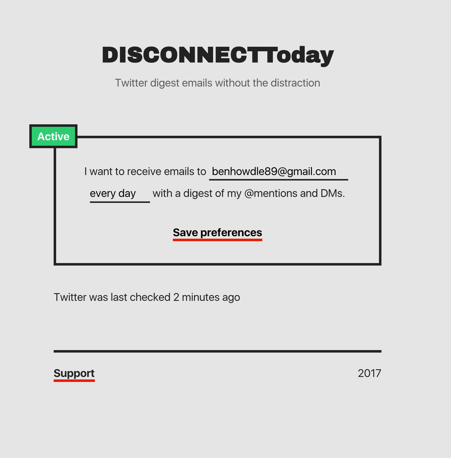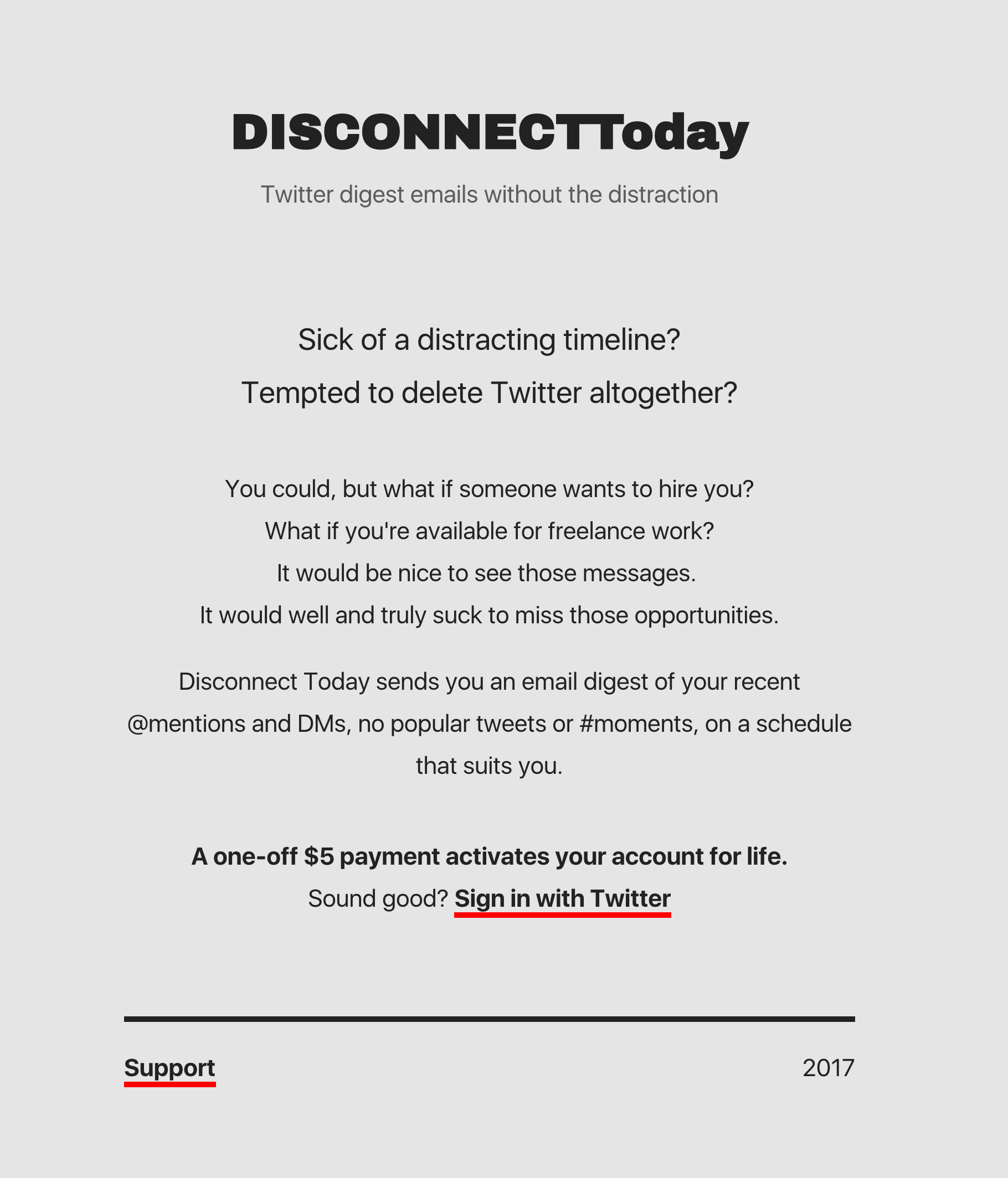 I built Disconnect Today for purely selfish reasons - I would dearly love not to be distracted by checking Twitter, but then I also still want to see potential freelance enquiries, or other opportunities through DM.