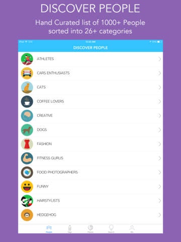 1- It let you 'discover' amazing people in variety of categories. Initial list of the categories and people inside are picked by me based on variety of factors but i will add the feature for people to make their own 'list' in the c… See more