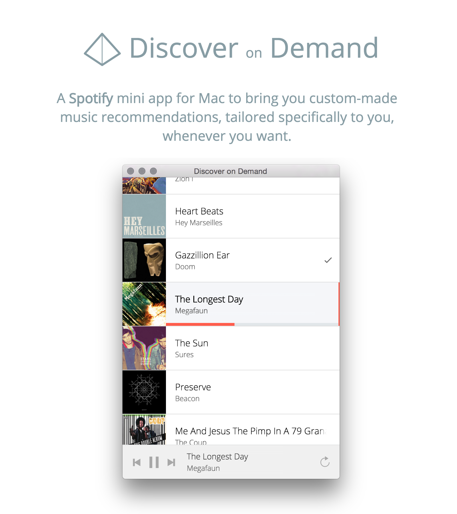 I love Spotify's Discover Weekly but by Wednesday, I've already listened to the whole thing. I created this Mac mini app to bring you Discover Weekly but whenever you want. Not just on Mondays.