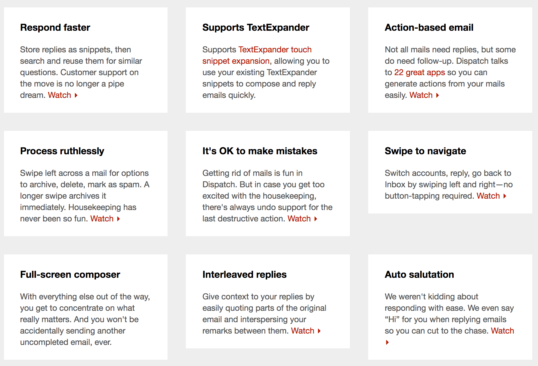 I'm in the same boat - I've tried a bunch of other mail apps for iOS and Dispatch is the one that's stuck. I think with iOS 8 it'll still be a while before Dispatch's impressive integrations aren't such a stand-out. @_jacksmith They've integrated with a whole bunch of apps, so for each link you can choose to send it to Chrome or Safari, but you can also send… See more