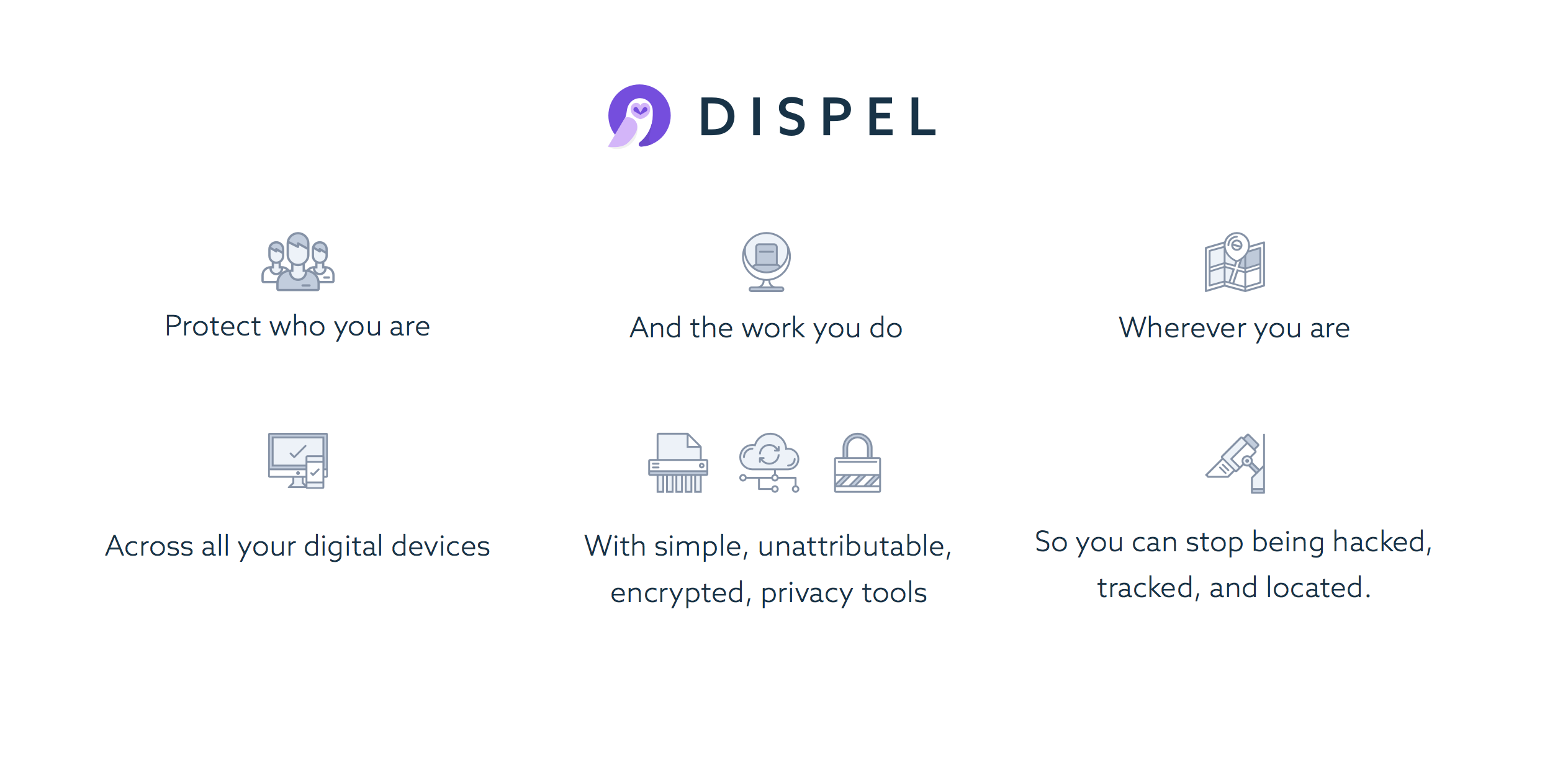 Dispel gives you powerful tools to protect yourself and your company from eavesdropping, hackers, and corporate espionage. Comprehensive data, identity, and location protection across all your online devices.