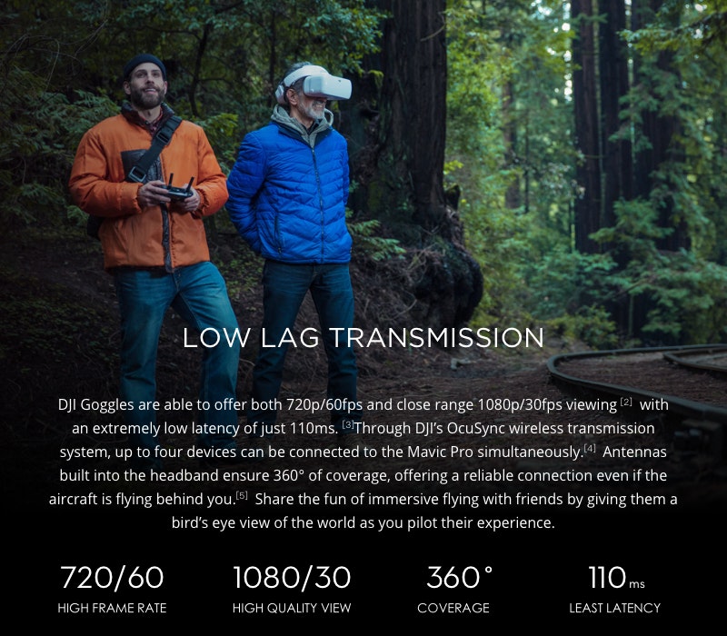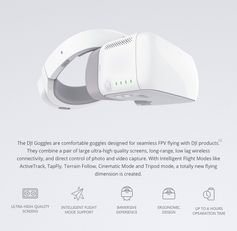 Natively compatible with flagship DJI products, DJI Goggles feature two 1920×1080 displays and an OcuSync wireless transmission system that provide amazing FPV flight experiences.[1] Thanks to their optimized touchpad and Head Tracking, control is amazingly easy and intuitive. In addition, users can view panoramas, listen to audio files, and watch video files in various formats.