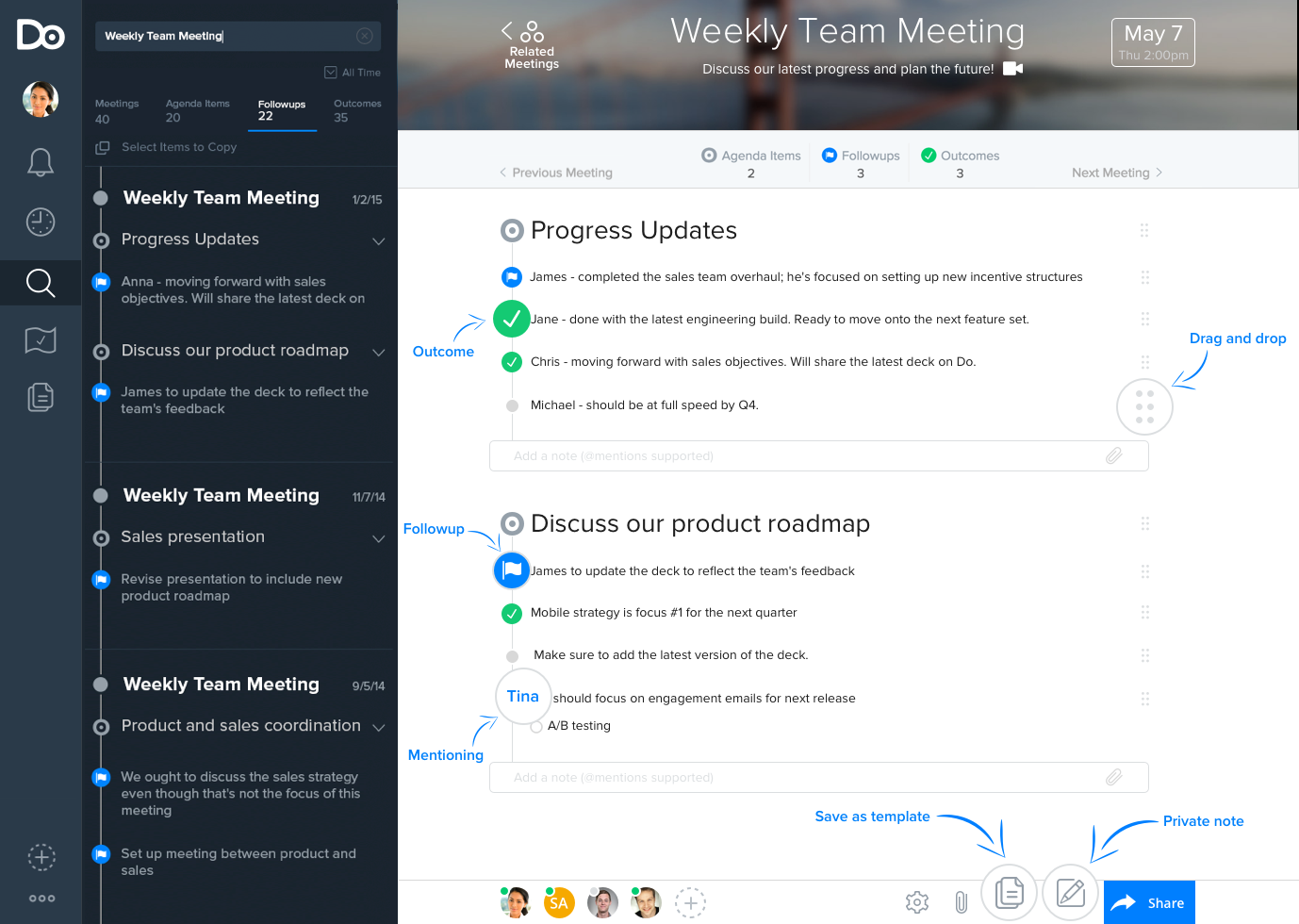 RE: follow on tasks...you can mark items as 'Followups' and they will be visually separated from all other notes (in Do and when exported). We are exploring surfacing all followups to you in one simple place, and also considering integrations with major project management and task management appl… See more