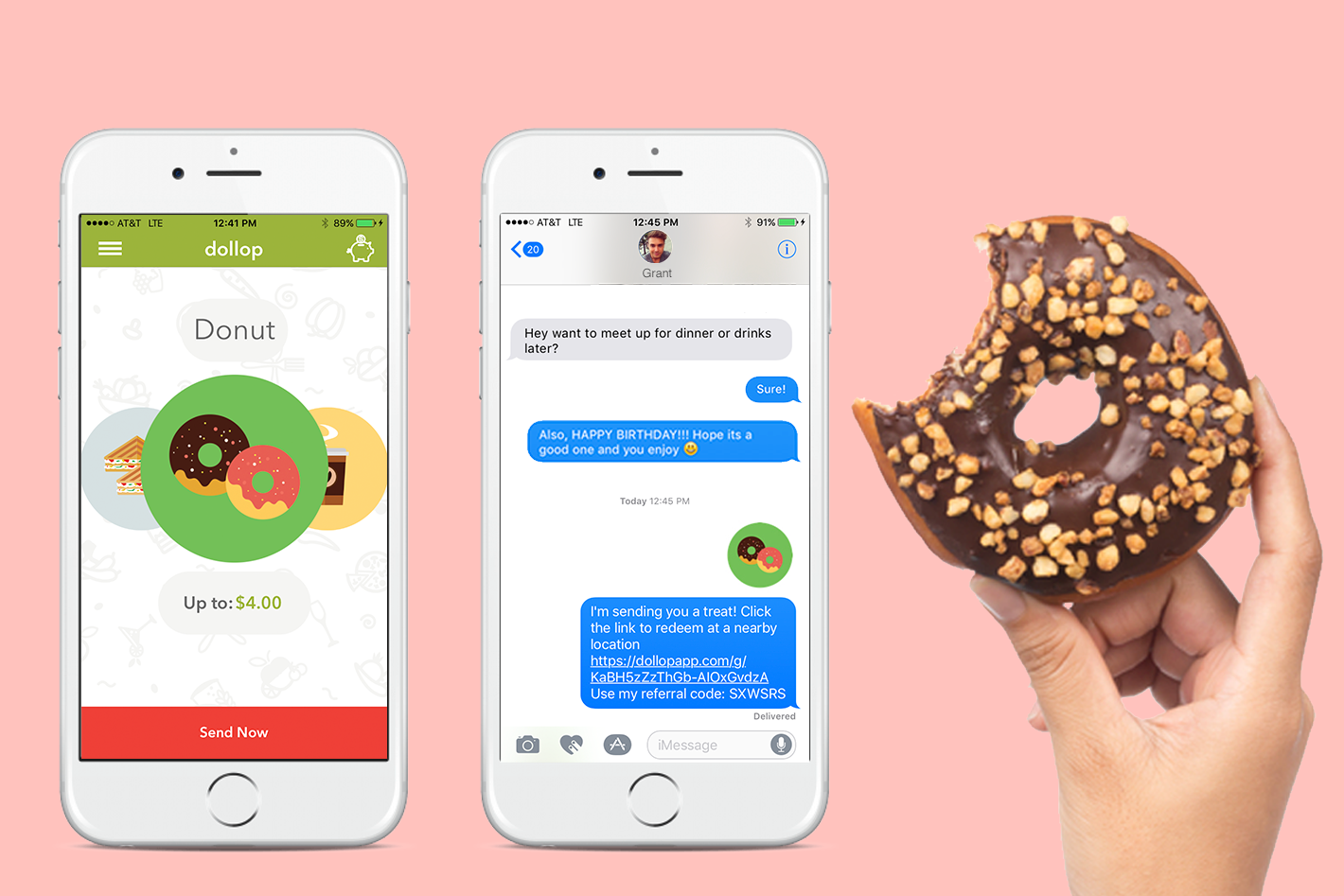 Let me introduce you to our app. Dollop is an app that lets you give a real treat to a friend in the special moments big and small. They’ll get a real gift instantly via text and can redeem at a participating location of choice.