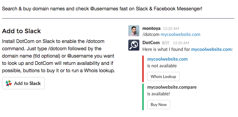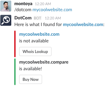 Hi all! I had an idea: what if you could look up domain name availability without ever leaving Slack? And you could even query whois info or get links to buy the domains too. So I set out to build something with Slack's new message buttons and it actually works quite nicely. I also went ahead and built it on Facebook Messenger too. And then I added support f… See more