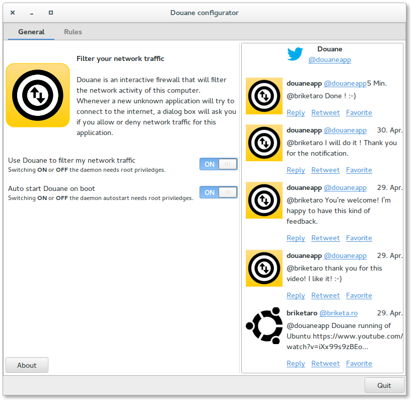 When an application, which is emitting some network packets, but is unknown to Douane, the application is blocked and a popup ask you if you allow the app to access the Internet (or network) or if you want to deny it.