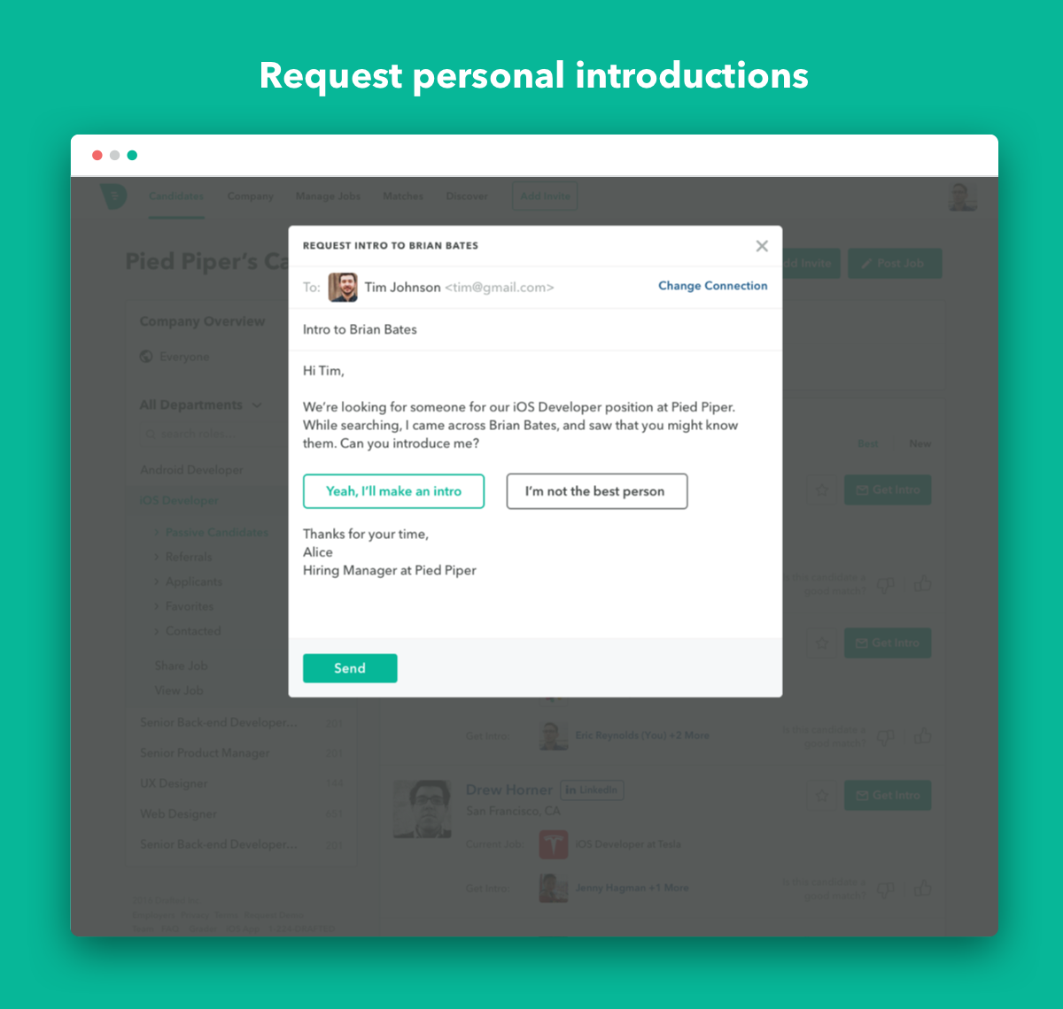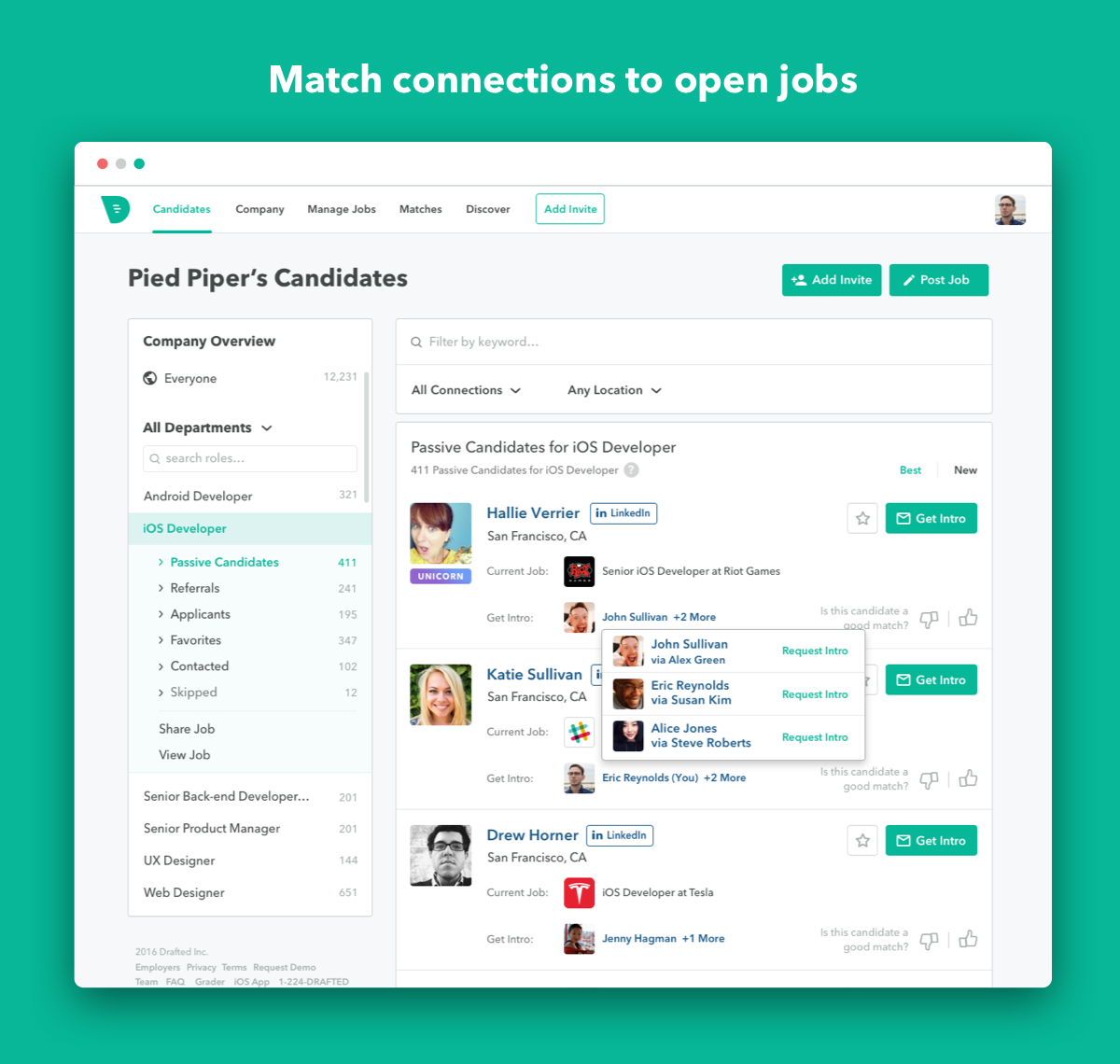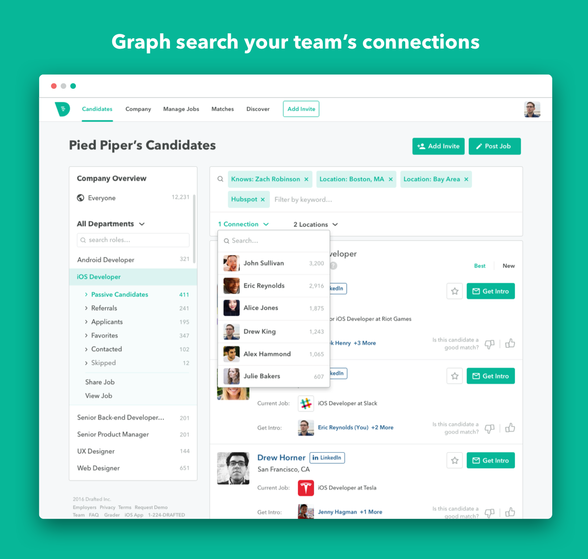 Employee referrals is the #1 way most companies hire. By building an open marketplace for referral based hiring, Drafted enables employees as well as a company's extended network to refer candidates from their own networks, help their friends get great jobs and get rewarded along the way.