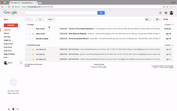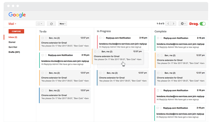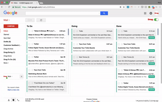 Drag Free is a free tool to transform your Gmail into organized Task Lists. Drag’s Task List app turns your inbox into a manageable workspace (just like Trello, but for Gmail). Drag ‘n drop your emails between stages; To Do, Doing and Done, and customize them. It makes the hours spent in your inbox a whole lot easier and more organized.