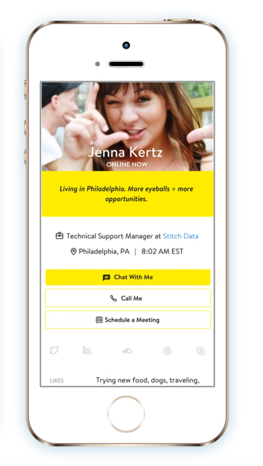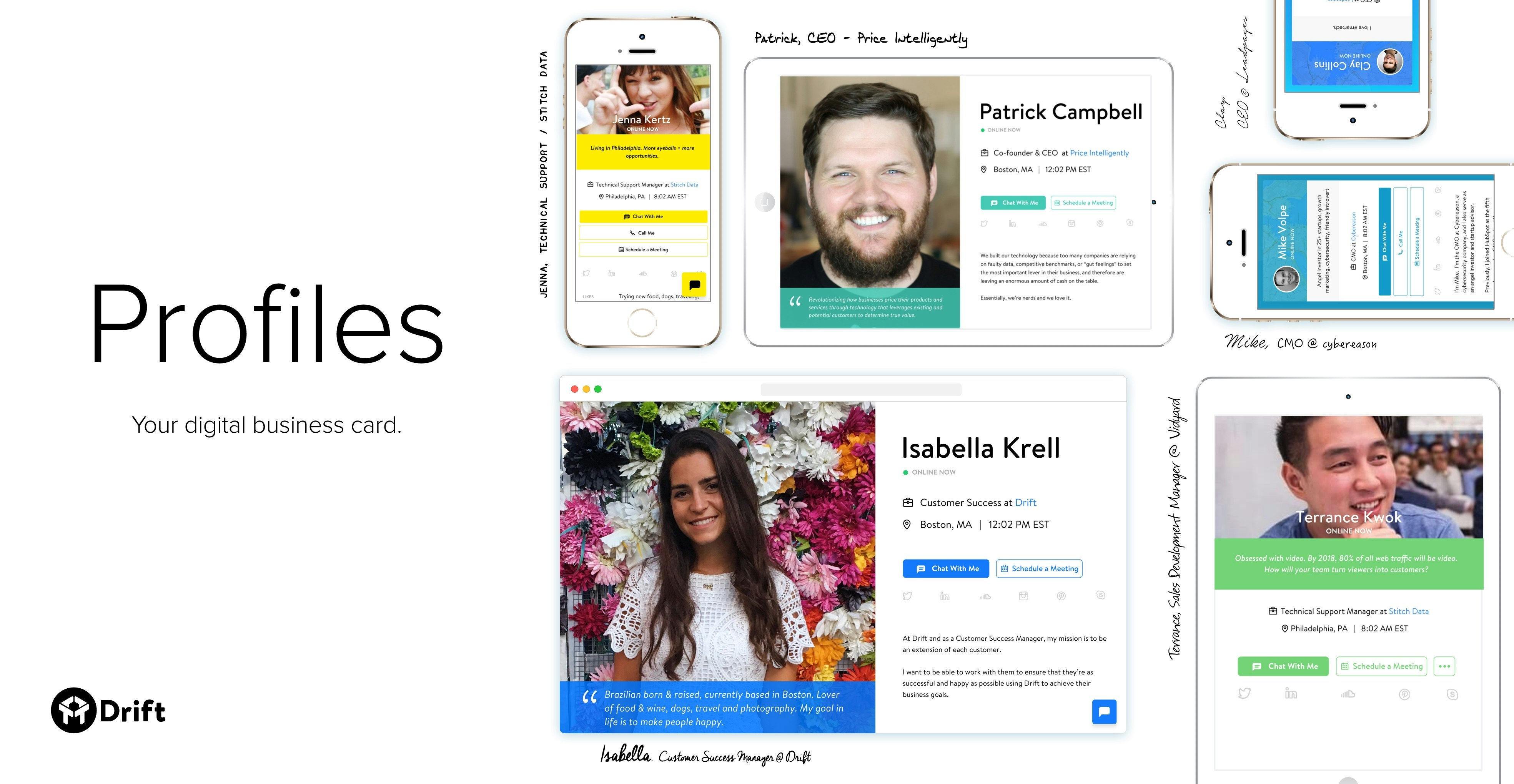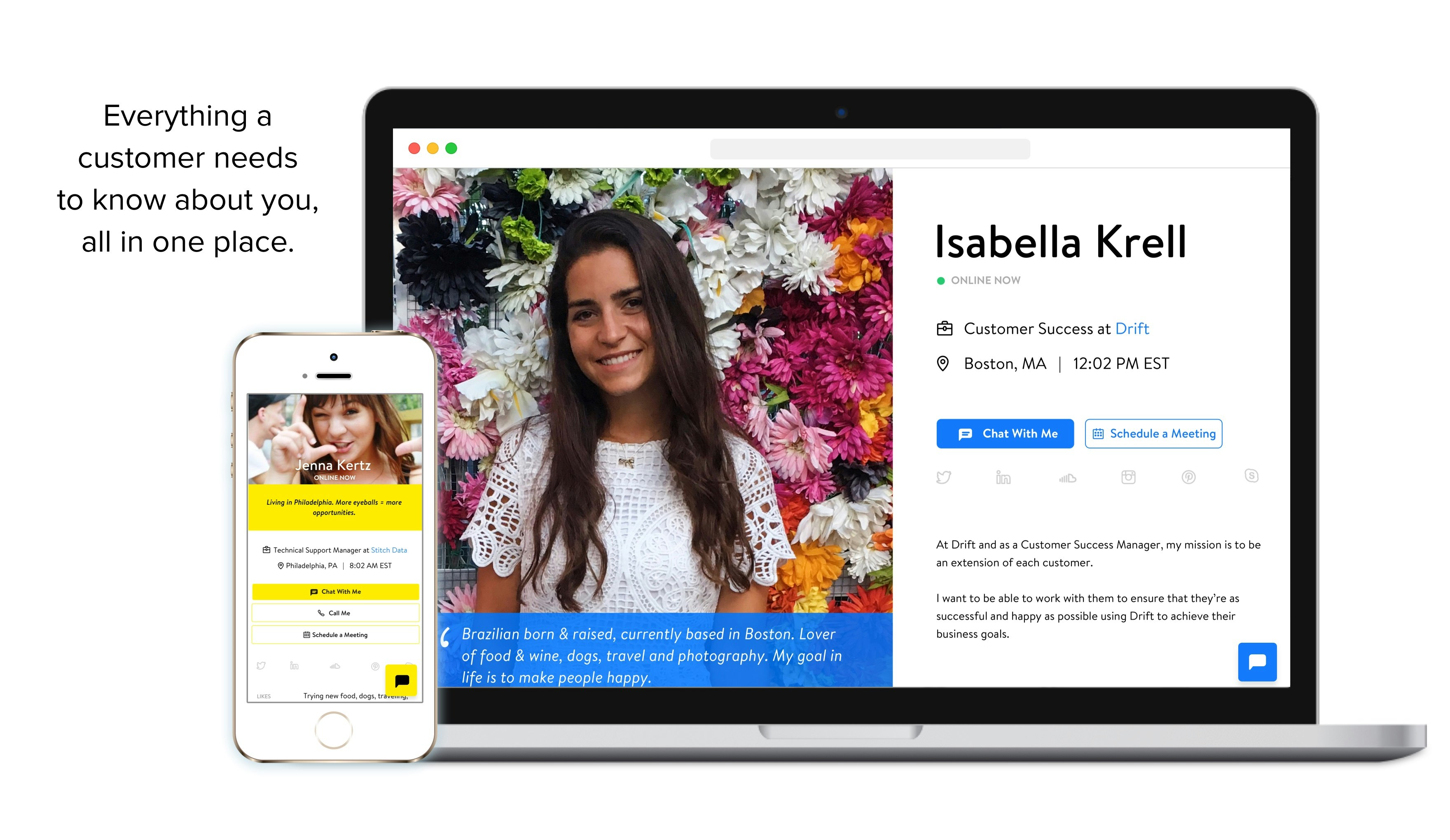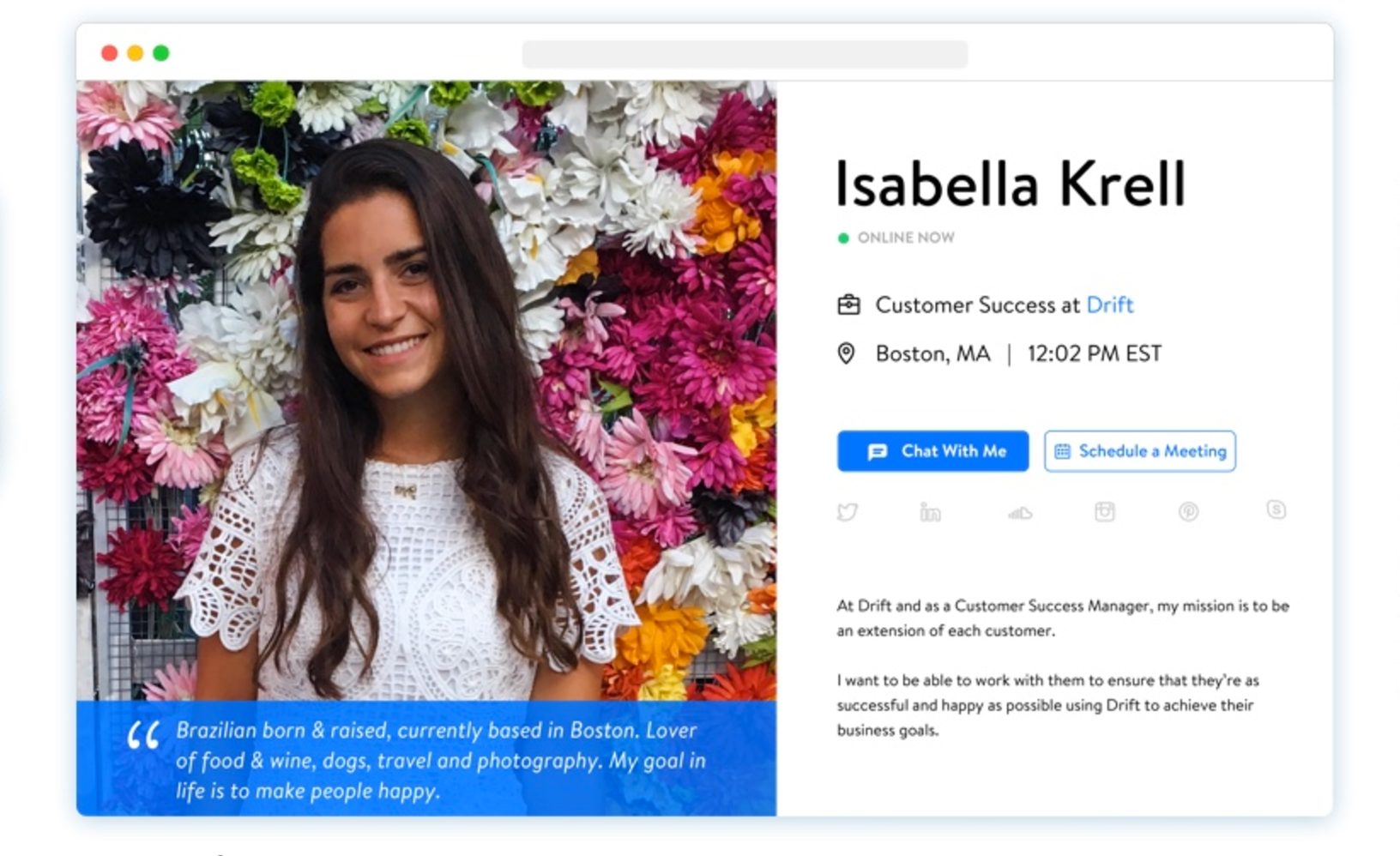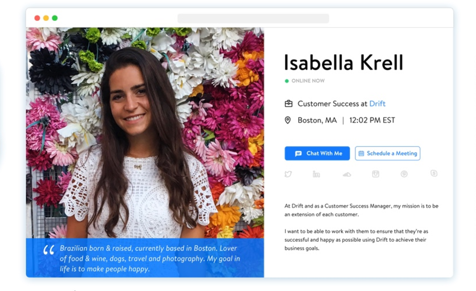 This is pretty cool. Profile pages for each person on your team that connect to Drift's customer communication platform. It's a really effective way to help customers solve their problems, faster. And its included with a free Drift account.