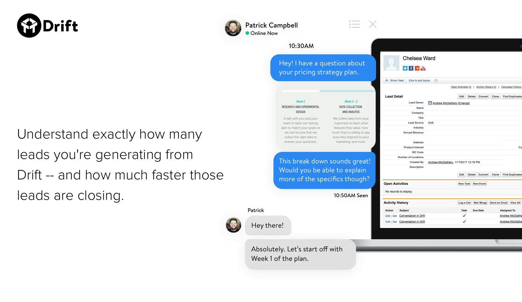 I've been using the Salesforce integration for the last week. It works great, and there's literally nothing to configure. New leads are automatically created In Salesforce, and chat transcripts are added to leads and contacts as tasks. The pace that Drift is shipping new features is unlike anything else I've seen in SaaS.