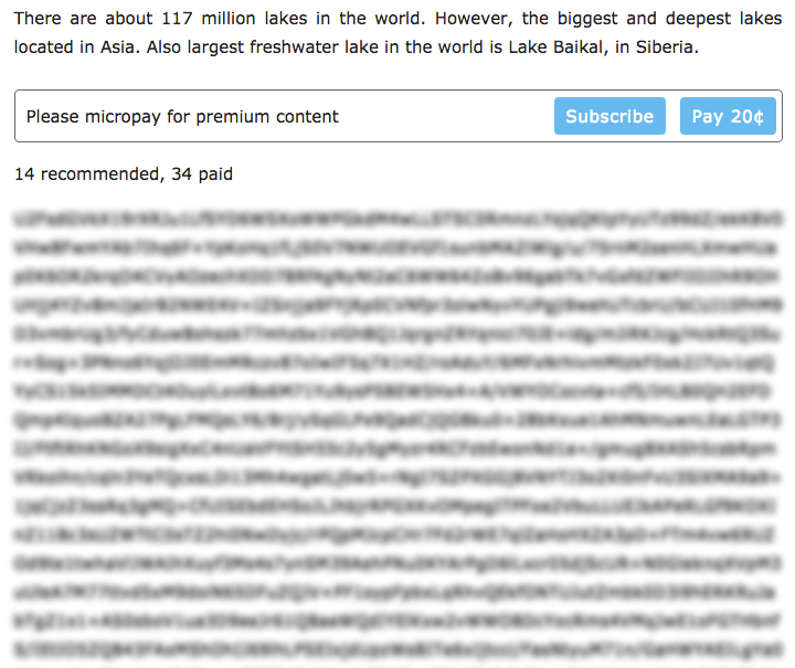 A simple add-on which allows website owner to individually paywall content. Add-on allows website visitor to micropay anywhere between 5 to 15 cents to access a paywalled content.