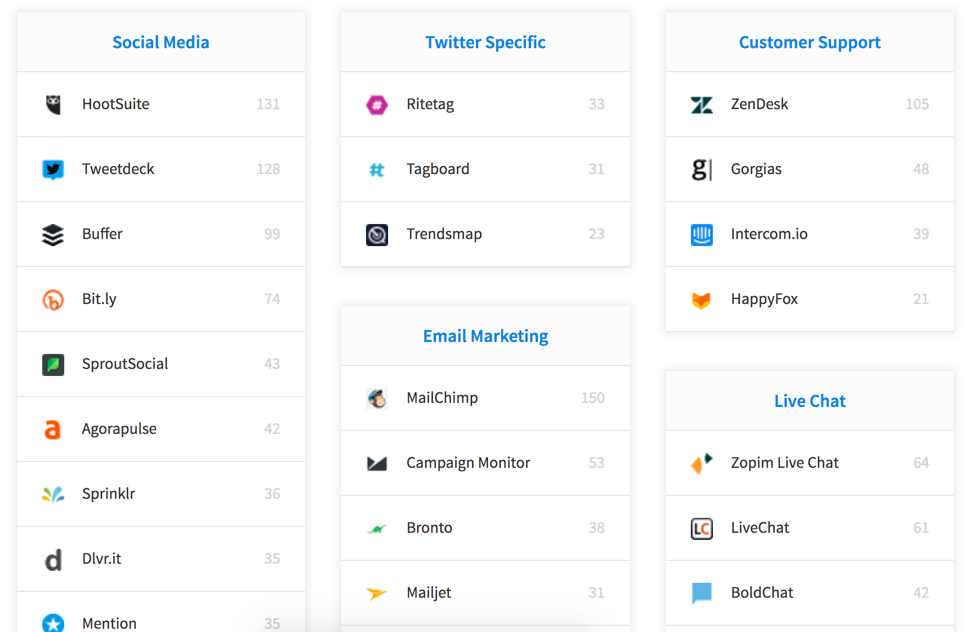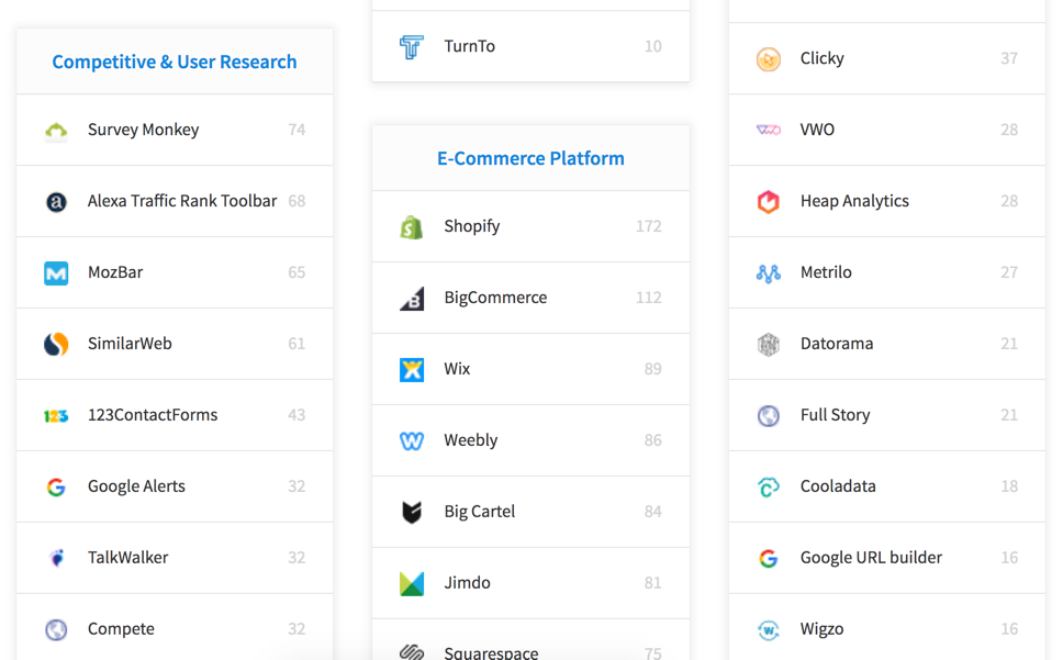 There are a few stacks on PH. This one shows usage among the most popular stores. There are ~20 categories (analytics, email marketing, user engagement, etc.), and for each category, we listed the tools compani… See more