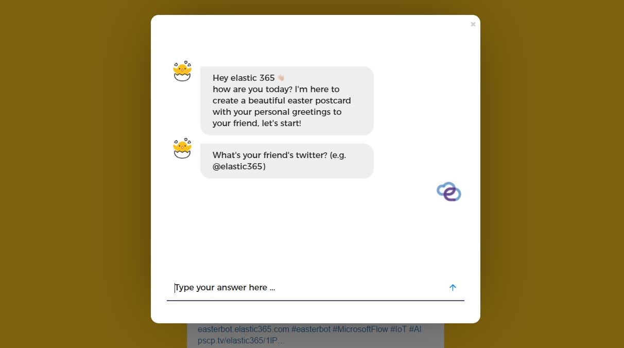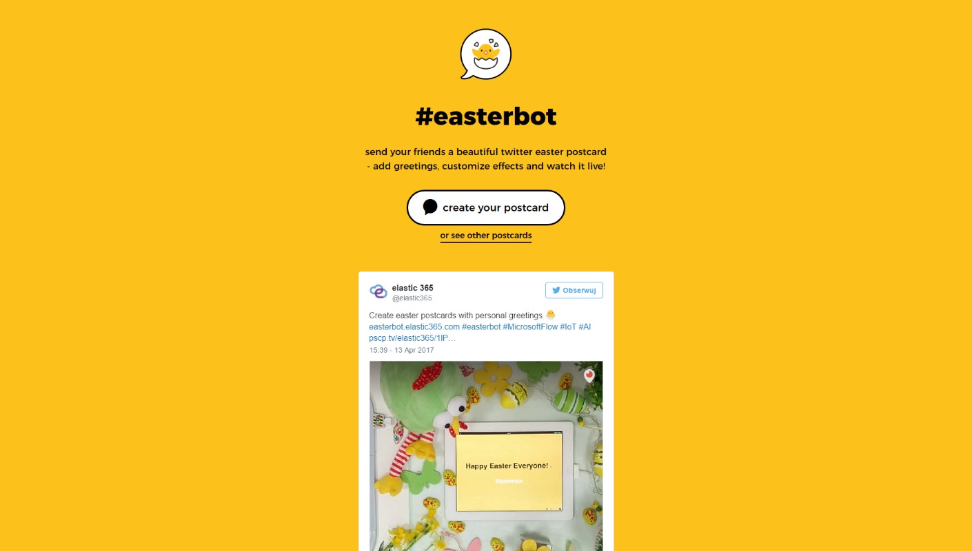 It's a chatbot, which posts a beautiful twitter postcards with your greetings, some blinking lights and a little yellow chicken on a spinning flower :D