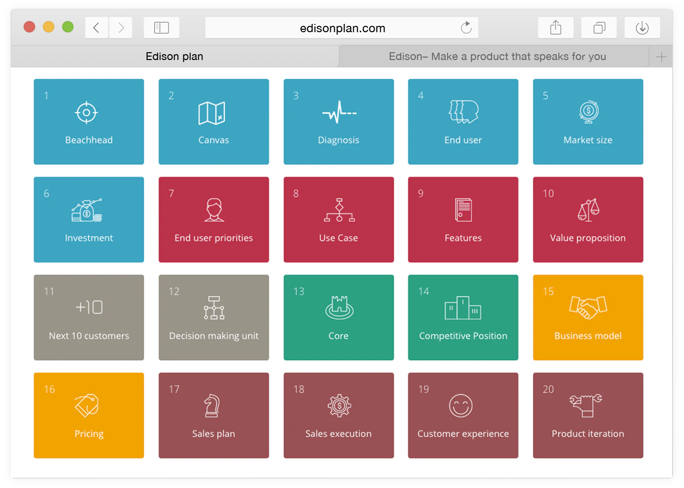 EdisonPlan is significantly based on the Disciplined Entrepreneurship framework created by Bill Aulet of Martin Trust Center for MIT Entrepreneurship.