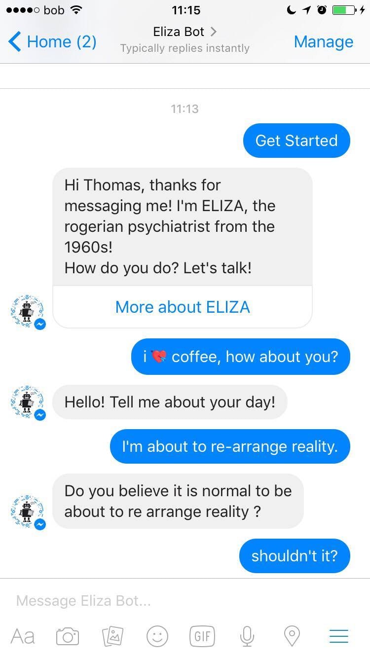 hi Thomas, thanks for featuring ELIZA! With this chatbot I recreated the original chat script from the 1960s.