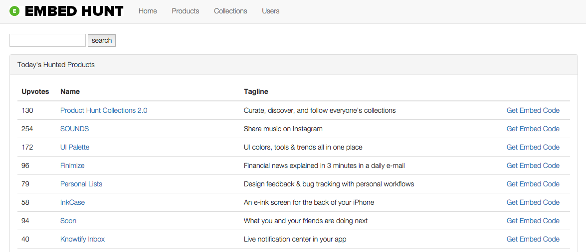 Search for the product you want to display. You'll get a simple javascript snippet you can add to your site to show the details of that product's hunt.