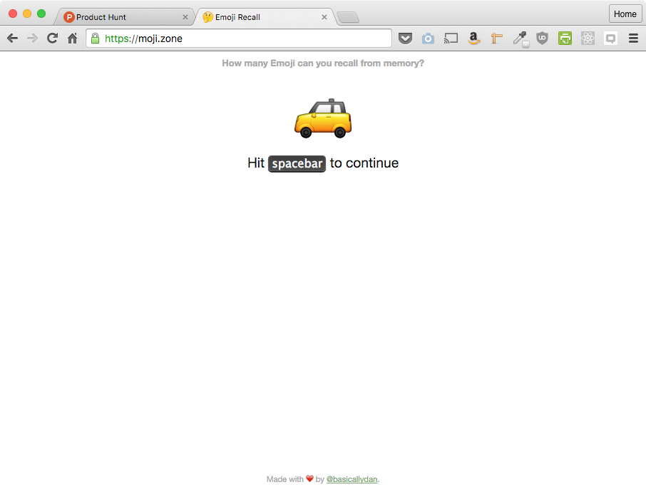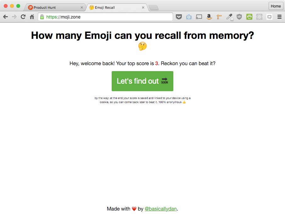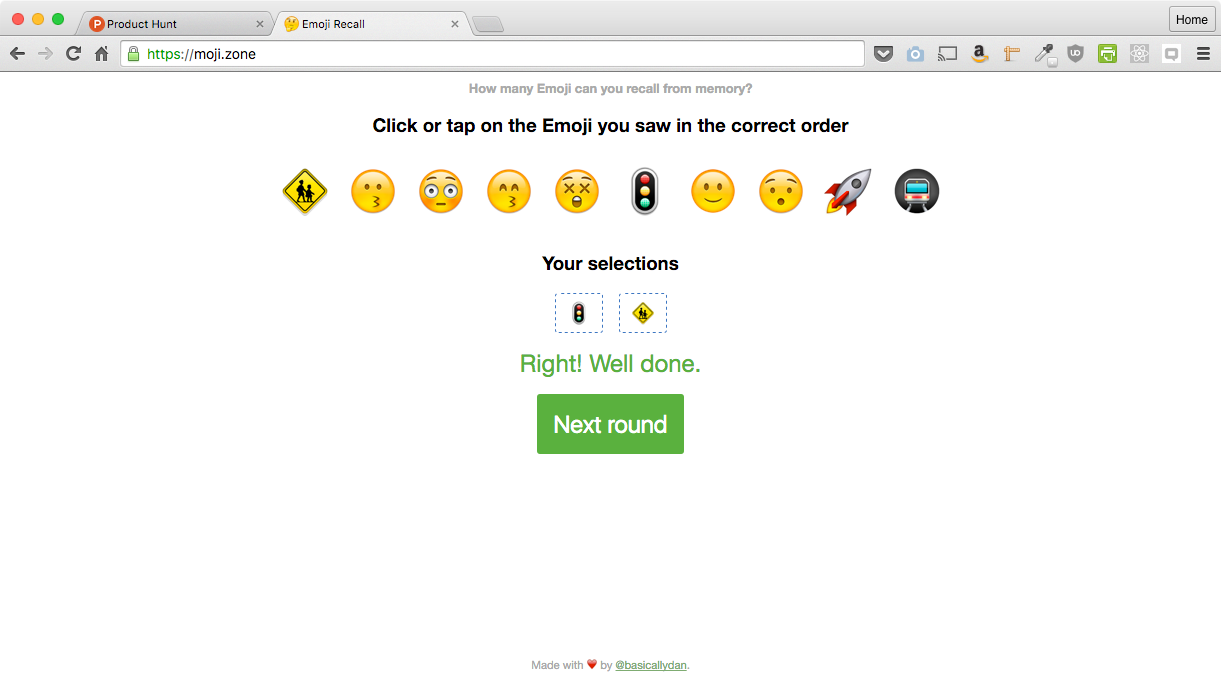 Hello! I hope you are enjoying Emoji Recall. The general idea is self-competition at the moment, but I am storing loads and loads of scores and the time it takes to recall things. I'd like to show how recall changes as number of Emoji goes up, too, so I should be able, eventually, to make some pretty graphs depicting this stuff :) let me know what you think!