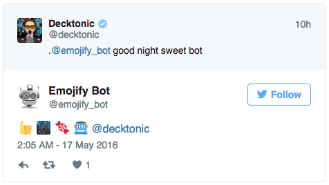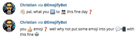 Hi! Just launched my first bot, available on Slack, Telegram & Twitter. It translates any text into emoji!