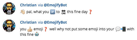 Just visit the website and click the "Add to Slack" button to enable the /emojify command, or visit the Telegram / Twitter link to chat with the bot! You can also use the bot inline in any Telegram conversation to emojify your message.