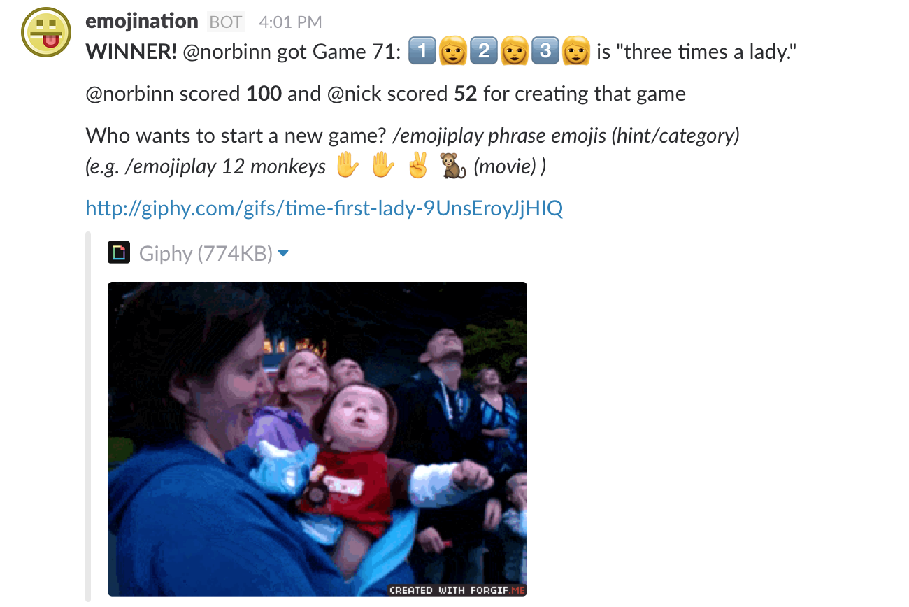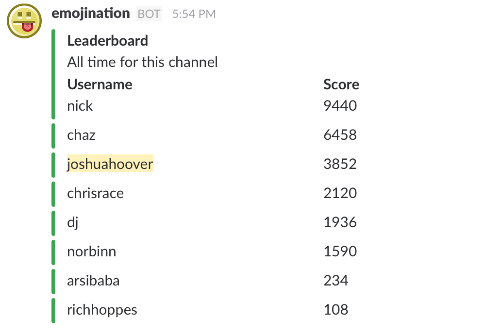I created this Slack game based on an idea from a friend. It's like charades with emojis. I'm finally ready to share it with others. I think teams will like it. A few clicks and it's installed: http://emojination.xyz