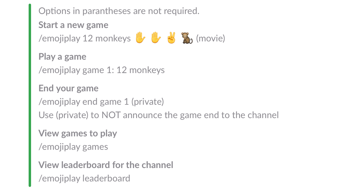 From there, go to your Slack channel of choice and start a game: /emojiplay 12 monkeys :hand: :hand: :v: :monkey: (movie)