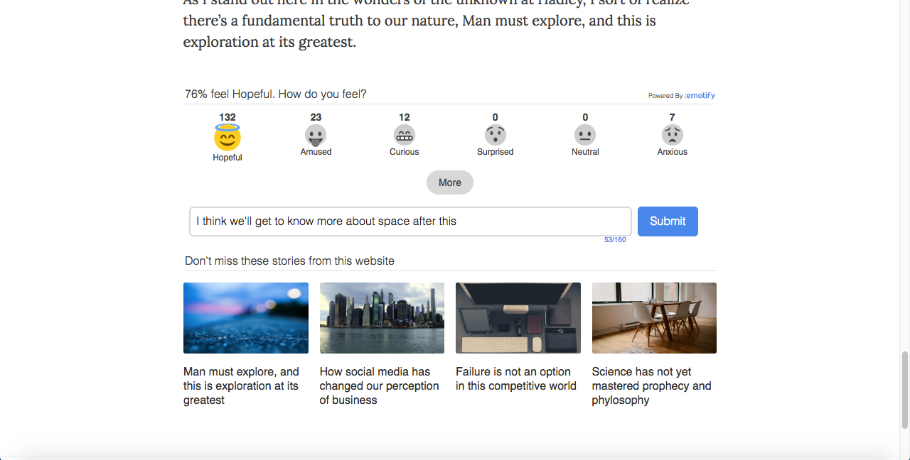 Emotify is a reaction and re-engagement tool for web publishers, news websites, and bloggers. It lets your readers/visitors seamlessly express their emotions on the story and re-engage them by suggesting more stories based on their current mood. Consider it a smart Facebook Reactions for your website.