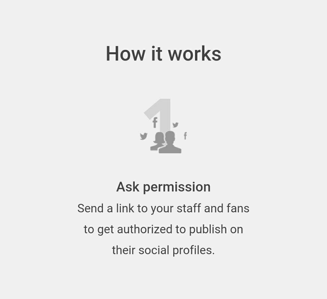 It allows you to post on the Facebook and Twitter profiles of your team (e.g. your coworkers), you just have to send them a link to get authorized.