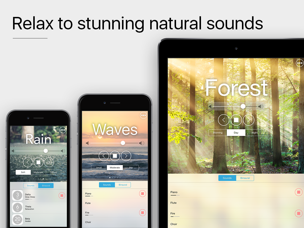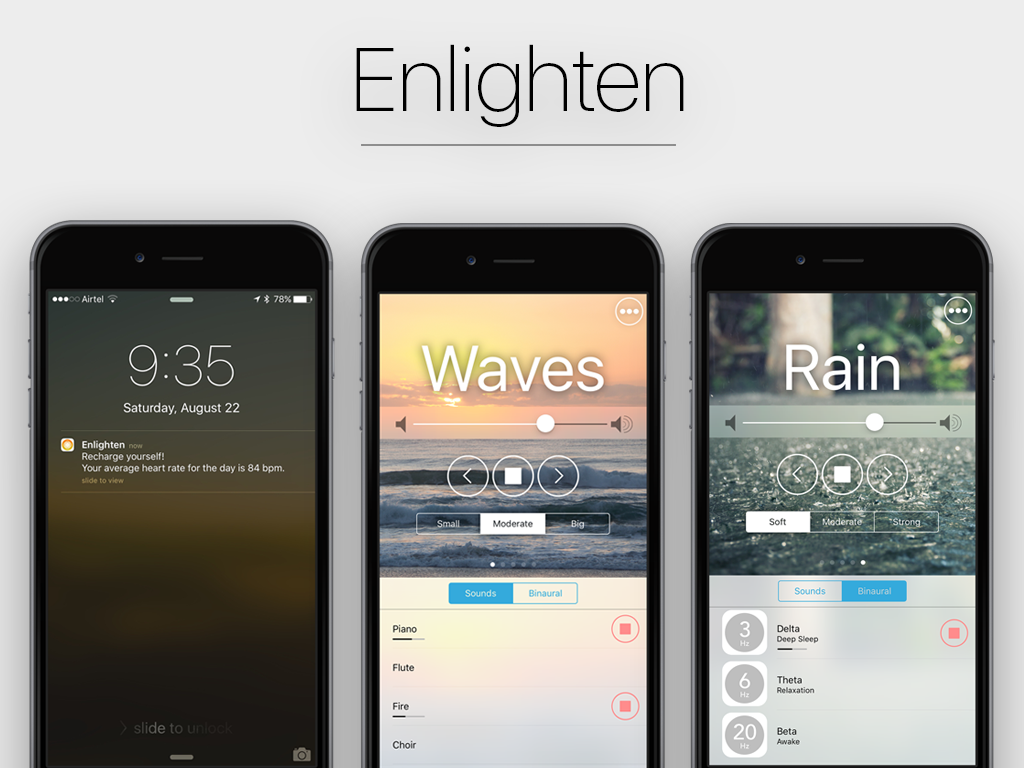 Enlighten is rest and relaxation app. It gives the user the option to choose from five main natural sounds and let’s them choose from three variations, it also has extra sounds and binaural beats.