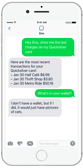 Capital One just released a "smart, funny and genderless chatbot...It understands emojis and is not afraid of anything." You can read more on their Medium article. I'm quite impressed with the AI team and Capital One design in general lately.