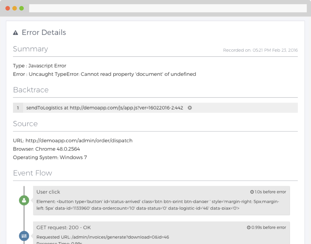 ErrLytics is a JavaScript Error Reporting and Performance Monitoring Tool that helps you find out bugs as soon as they occur and solve them faster than ever using features like user telemetry, advanced stack trace, and source map support. You can also monitor the performance of your application.