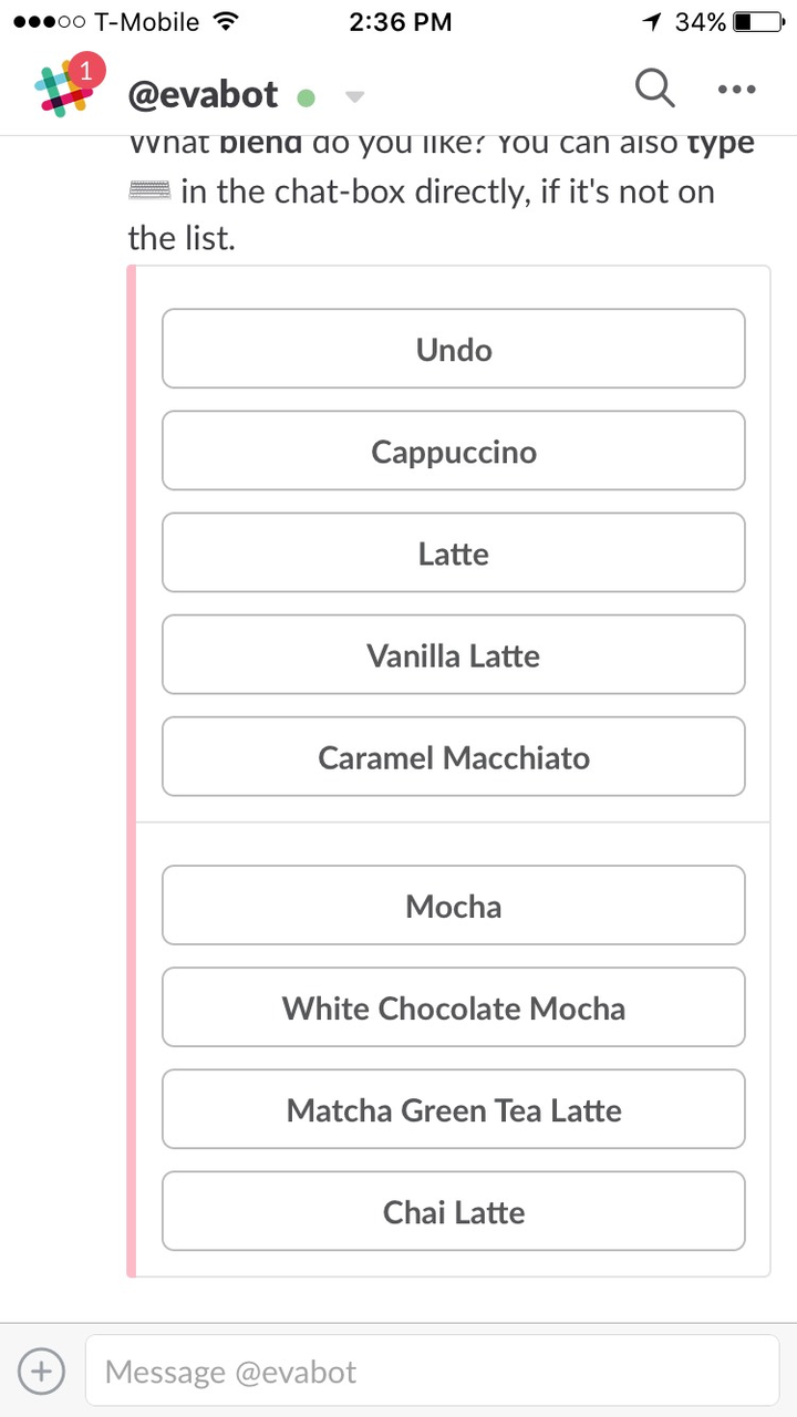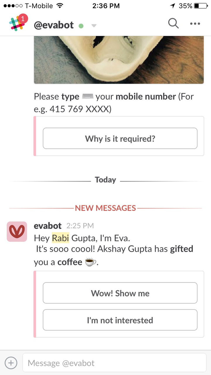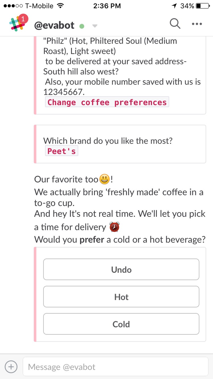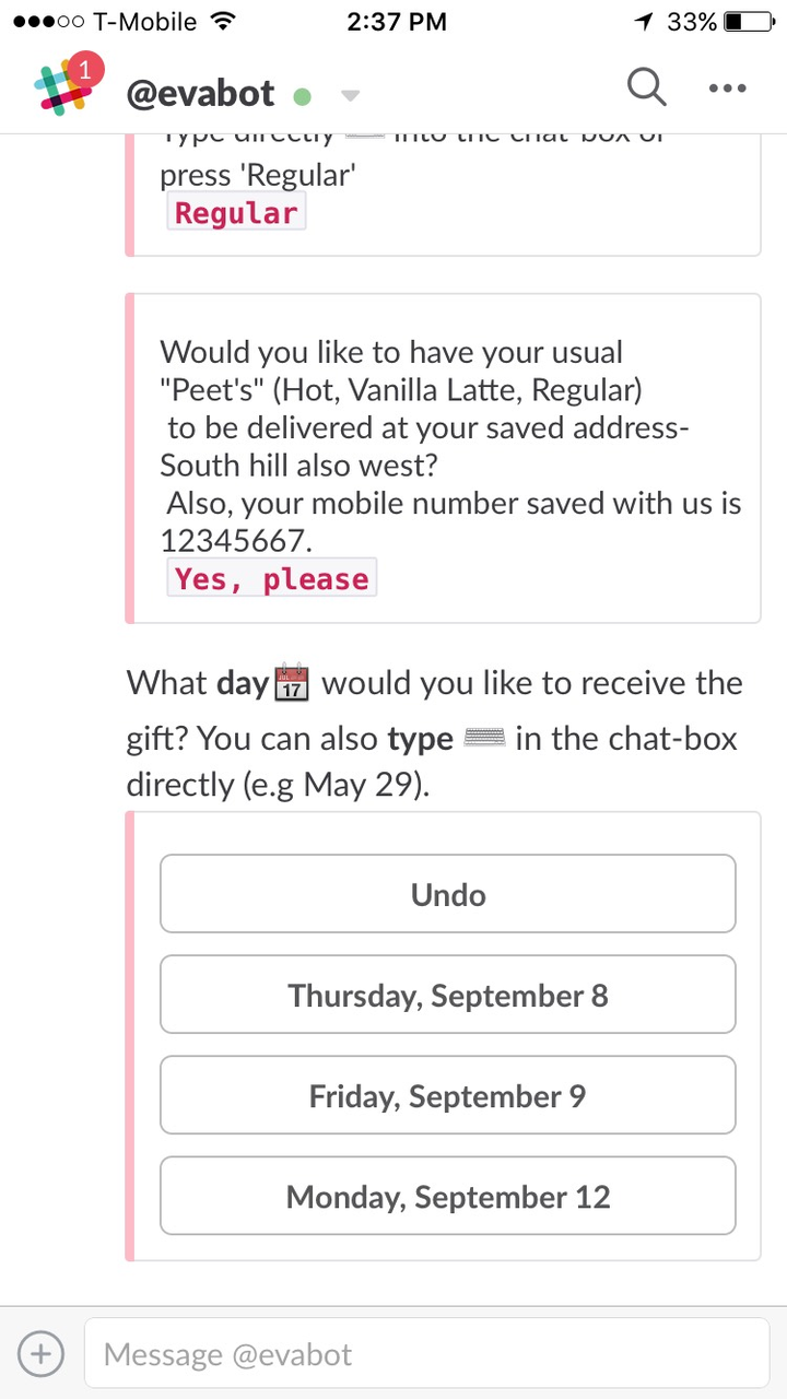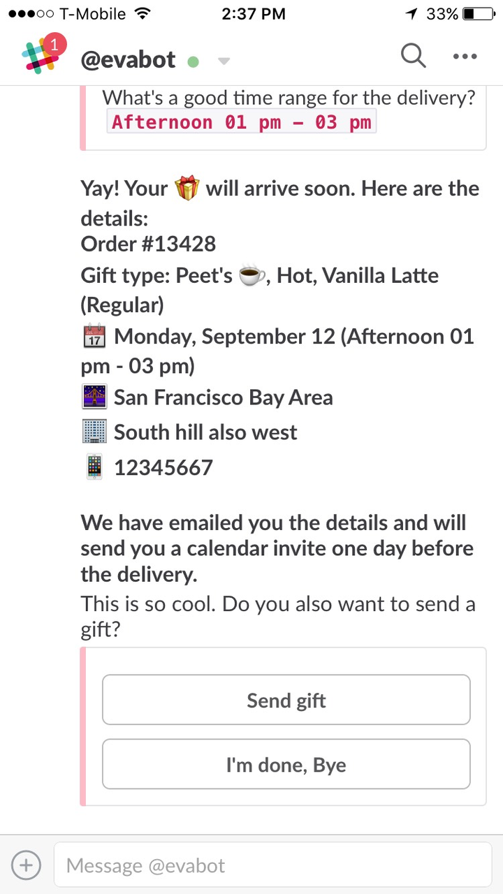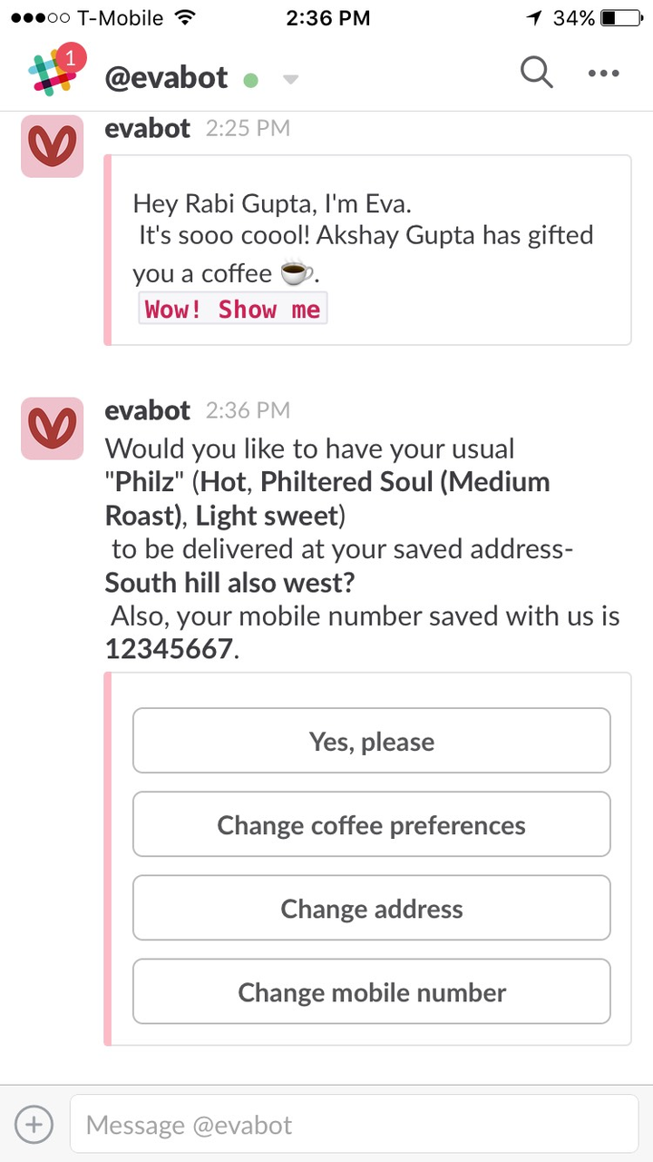 It's as simple as saying- "send a coffee gift to @kevin" and it's done. Evabot then chats with @kevin to get their coffee preferences and then sends a human Happiness Agent who delivers the gift with a hand written card and some chocolates, along with the gift.
