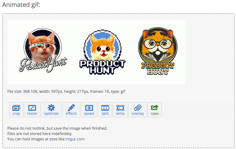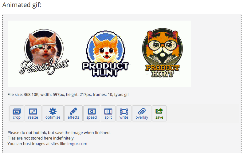 Just deleted bookmarks for 5 other gif tools and replaced them with this. Don't let the homepage fool you -- this thing is the (gif) bomb. The feature list is out of control: gif creation, resize, and crop. Optimize in all of the ways: frame removal (3 options), color removal, lossy image compression, etc. Split into frames for fine adjustments. Adjust speed… See more