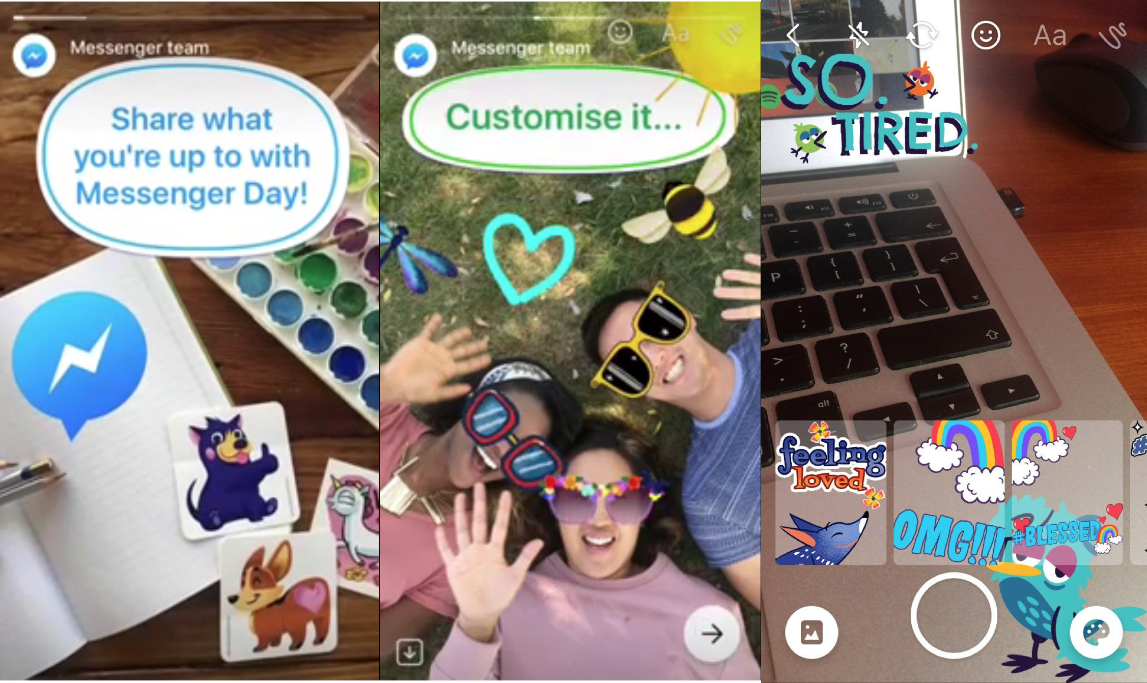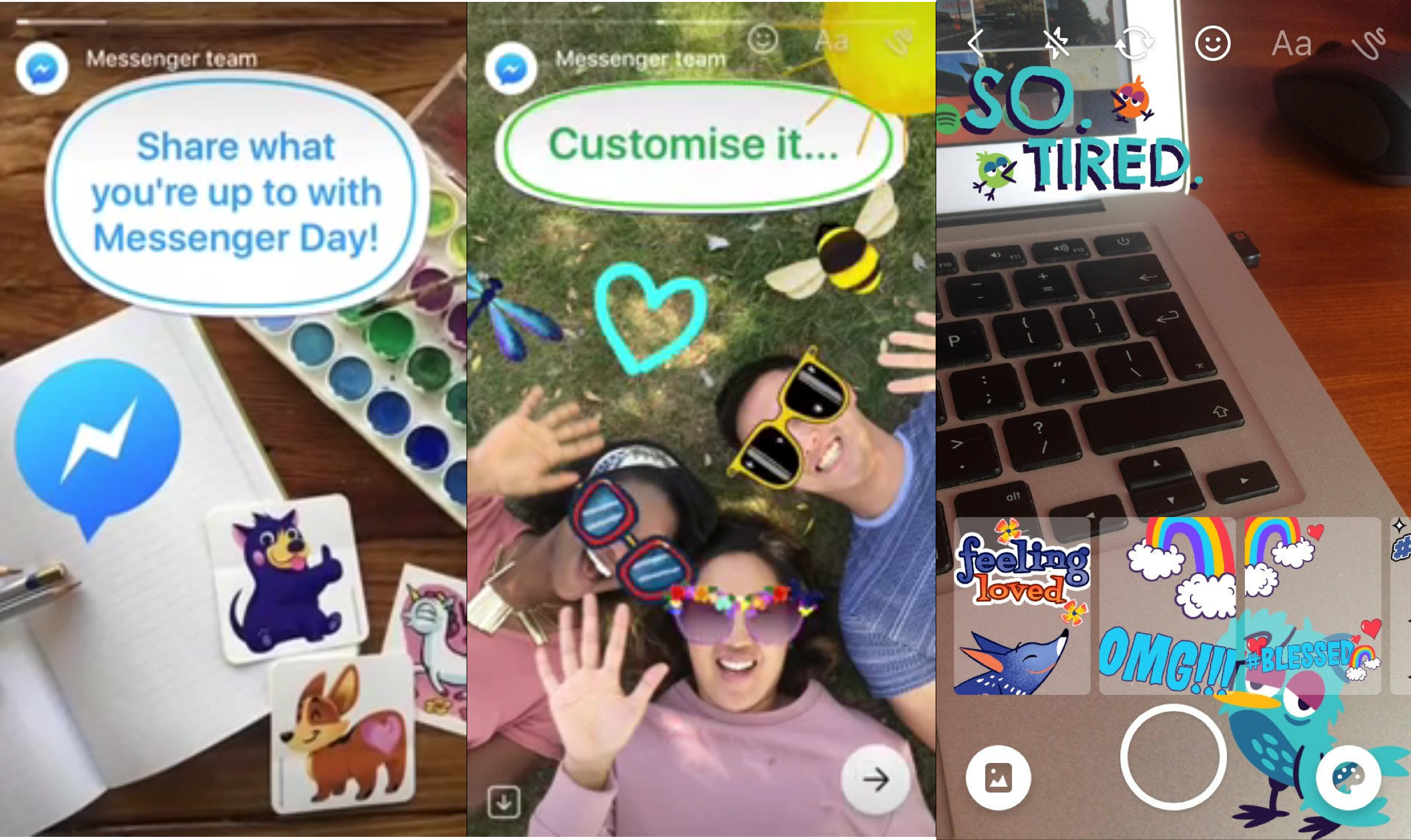 The only real innovation here is the share suggestion filters. On Snapchat, filters are for events, holidays, and locations. On Messenger Day, they help you share what you're doing, feeling, or are up for. You can get illustrated filters for "I'm feeling blessed" or "I'm up for a road trip". It's a smart way to help people share more visually appealing image… See more