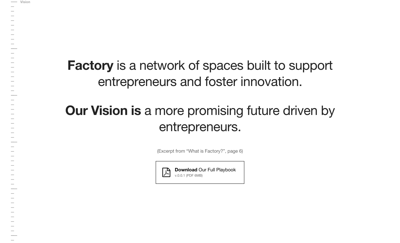 Hello product hunters. My name's Travis and I am on the Internationalization team of Factory (factory.co). We put this playbook together from all our learnings while building Factory Berlin in the hopes that it will help others building coworking spaces for technology companies (as well as for ourselves). We created this as a PDF download (http://www.factory… See more