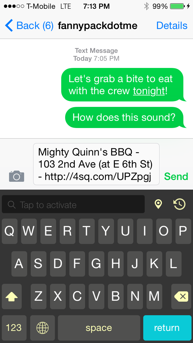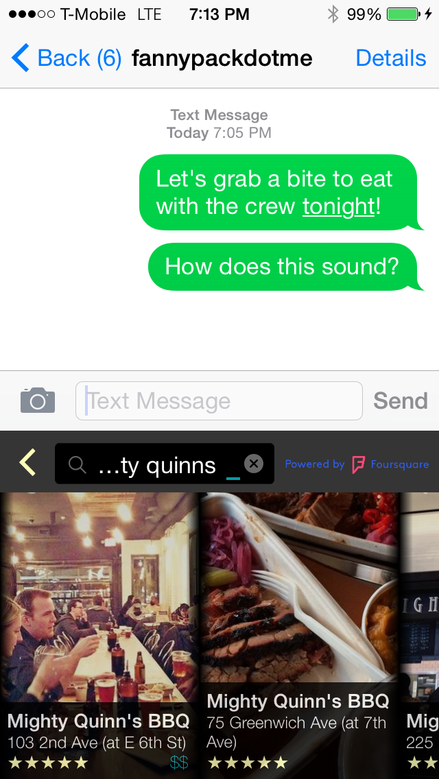 Have been able to use this for a week or so, and I have to say that the use case is instantly evident. When coordinating meeting up with anyone, location information is often discussed- and Fannypack makes it easy to share the information all from within your text. You don't have to send links, look up addresses, or share screenshots- it is intuitive, and ju… See more